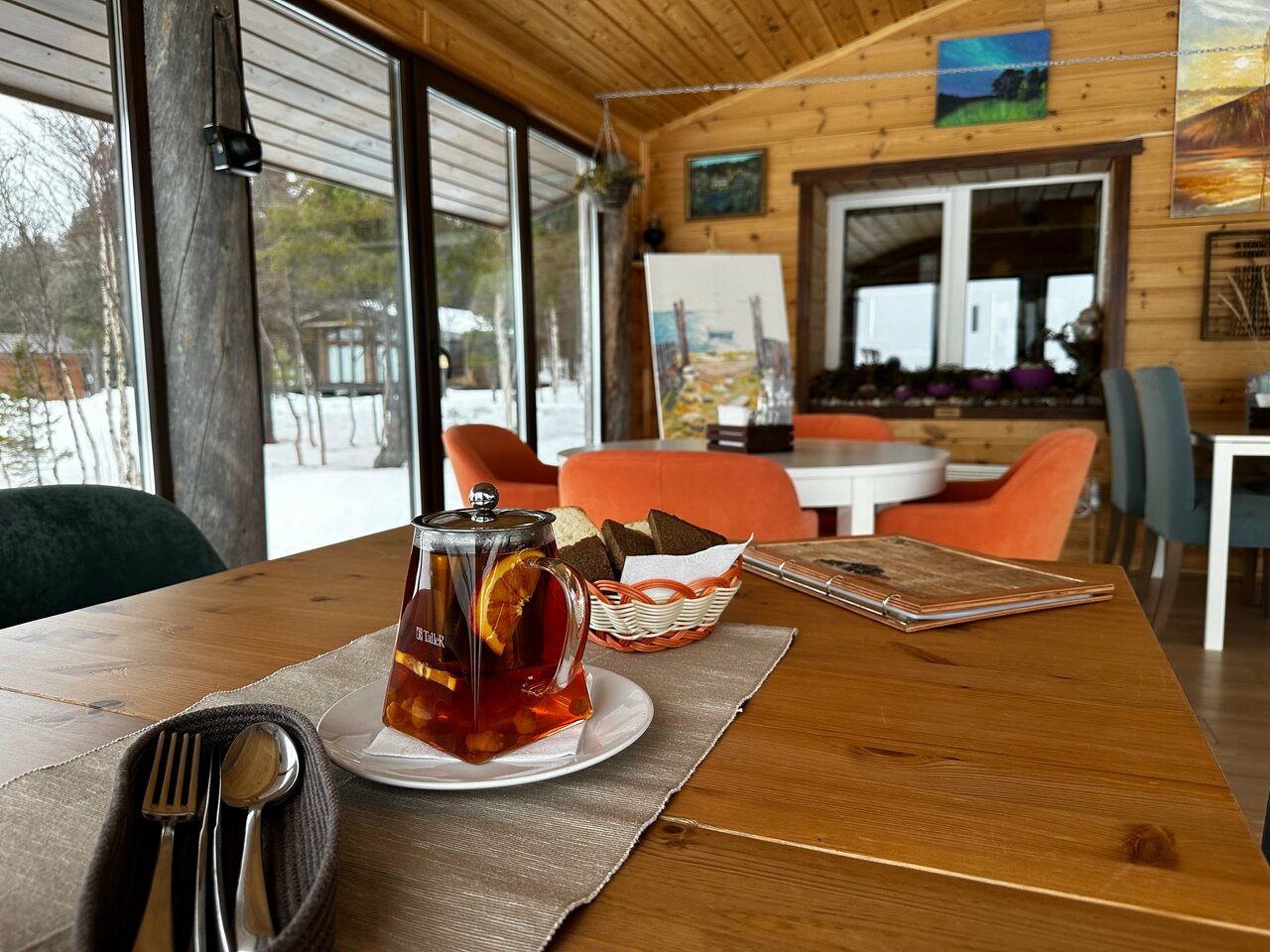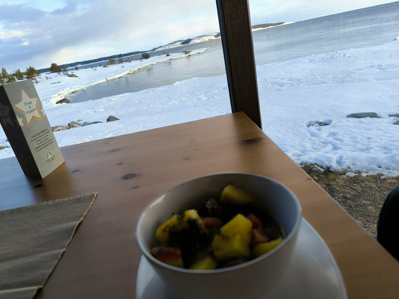 Сам местный, живу в Мурманске, заехали с девушкой поужинать- кто сказал, что здесь дорого в ресторане? В Мурманске куда дороже ценник порой, при чем порции такие, что плакать охота. Здесь вкусно накормили- брали уху, грибной суп, пасту с морепродуктами, морошковый чай. Очень сытно, к ухе прилагается рюмочка водочки! Вернемся еще не раз! Очень вежливый и услужливый официант, горячо рекомендуем к посещению!