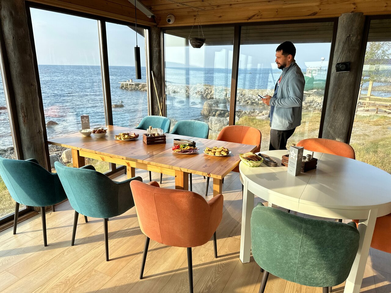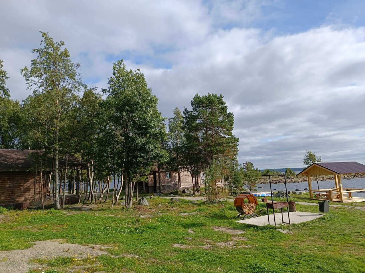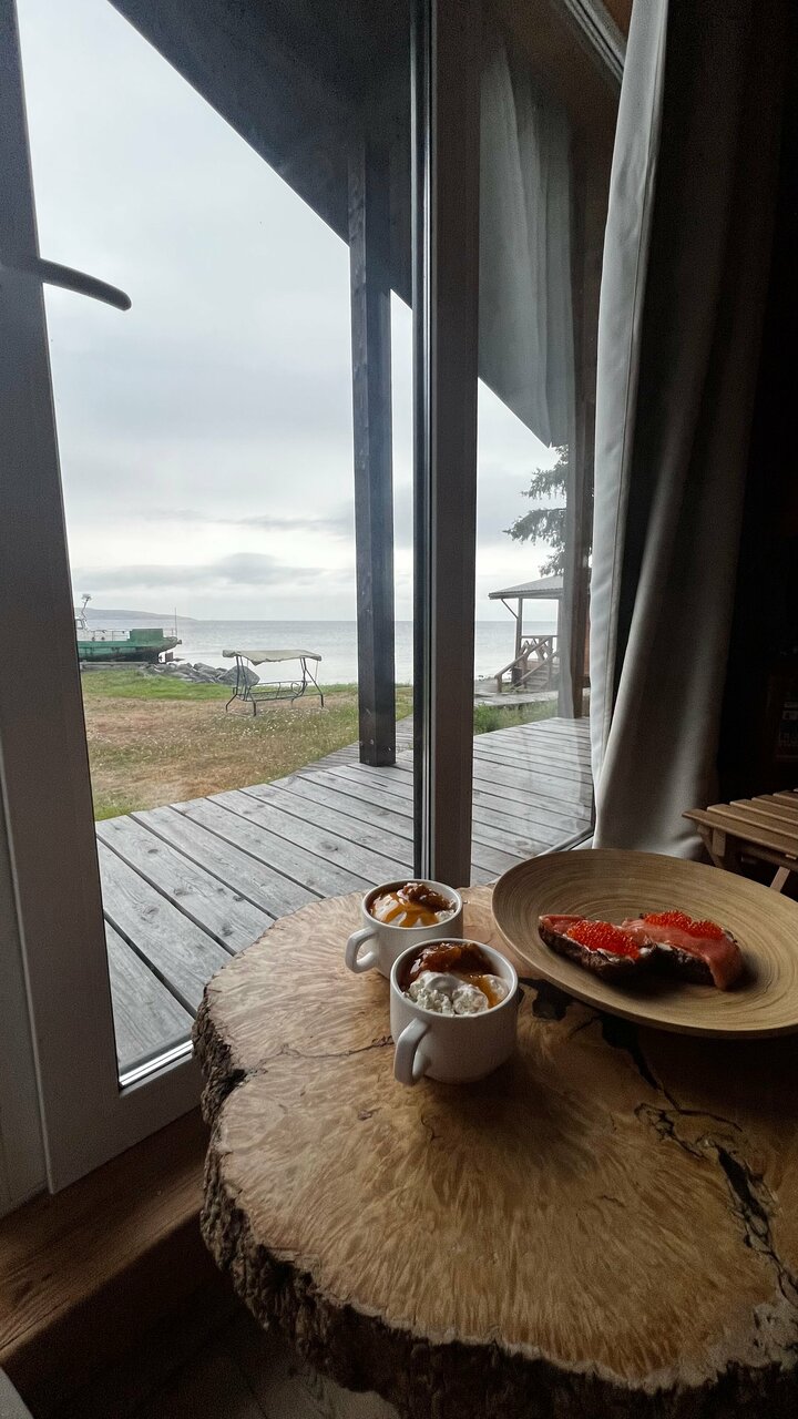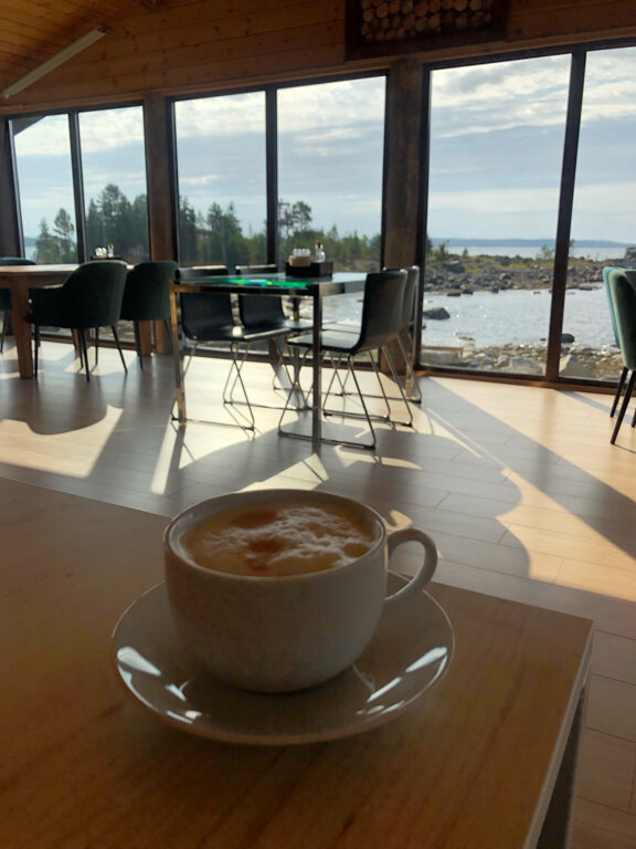 Место очень красивое. Прямо на бегу моря с соснами и камнями. Домики стоят в небольшом лесочке. На открытом месте недалеко от берега ресторанчик с видовым залом на море. Домики чистые уютные с панорамными окнами. У нас был вид на лес. Территория чистая. Очень обильный и вкусный завтрак можно наесться до ужина. Персонал отзывчивый. Перед териирорией есть остров на который можно пройти во время отлива. Это из приятного. Раздражает управляющий, который всё время ходит и дрючит персонал. Я не против, но можно это делать не прилюдно. В ресторане стоит обычная домашняя кофеварка в которой постоянно заканчивается вода, кофе, молоко. Варит долго и из-за этого на завтраке перед ней очередь. Ну и обидно, что место ни как не приспособлено для любителей порыбачить. Если захочешь выйти в море, то надо искать контакты в Умбе самостоятельно. В целом место очень красивое и уютное и этим перекрываются всё недостатки