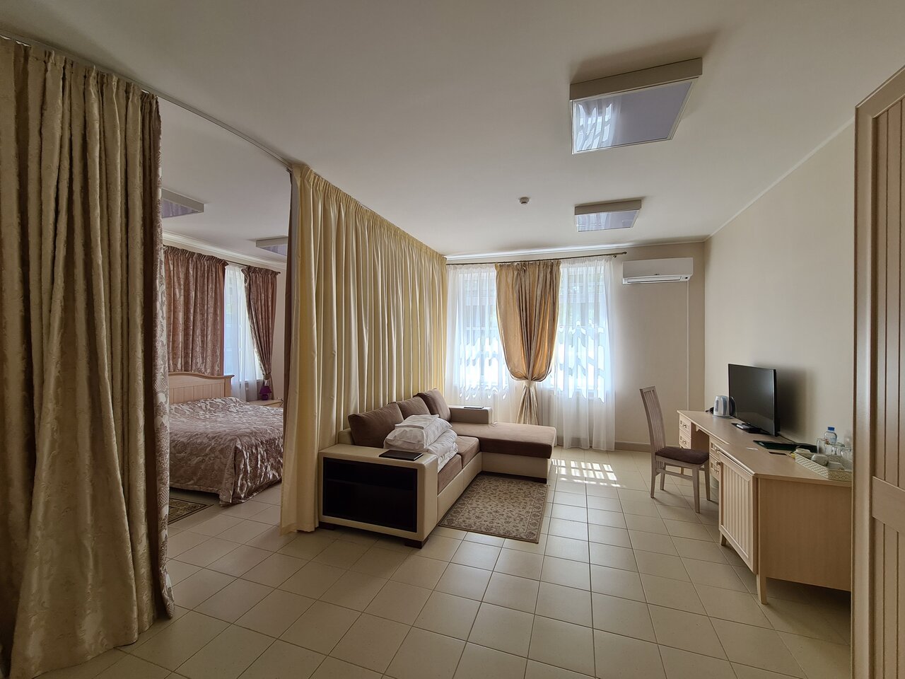 Жили в этой гостинице 6 дней в июле, номер огромный взяли с кухней, номер чистый, оремонтированный, огромная ванна. Расположение супер _ рядом парк Беккер и пляж. Минусы _ персонал не замотивирован на обслуживание гостей, уборка номер полностью была только 1 раз, то мыло не дали то полотенце то туалет бумаги нет. Завтраки с 9 до 12, если пришел в 10 то все осталась чуть тёплая еда, только 2 типа еды были с подогревом _ омлет и каша. Кофе ужасное из кофемашины. Го тиница имеет 2 корпуса, но ресторан работает только на завтраки и все, а в Янтарном мало мест где можно покушать. Обязательно откройте полноценный ресторан. Ставлю 3+ только за красивые номера и расположение