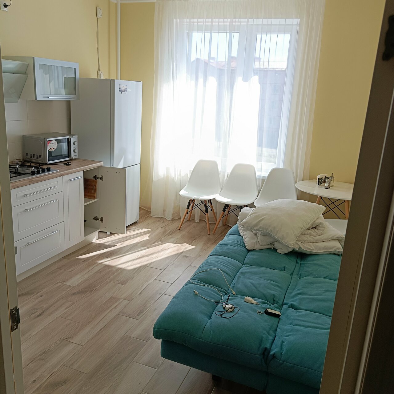 Классный отель. Все есть: чайник, посуда, стиральная машинка, сушка для белья, утюг и самое главное вид а море, но это конечно не во всех номерах. Пляж рядом. В окно слева видно маяк вдали. Янтарный комбинат с динопарком в пешей доступности. До центрального пляжа, как и до центра, минут 25-30 пешком.однозначно рекомендую.