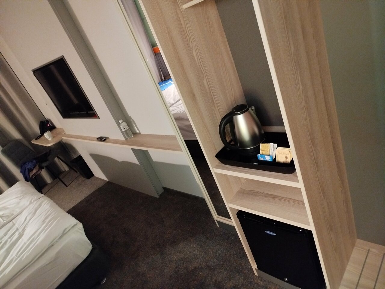 Новый отель немного в стороне от трассы — не мешает шум машин. Его наверное только открыли — все новое, стильно отделан. В номере чайно-кофейный набор, тапочки, огромный,телевизор, холодильник, вода бутылочная. В холле есть кафе. В общем достойное место для остановки в дороге!
