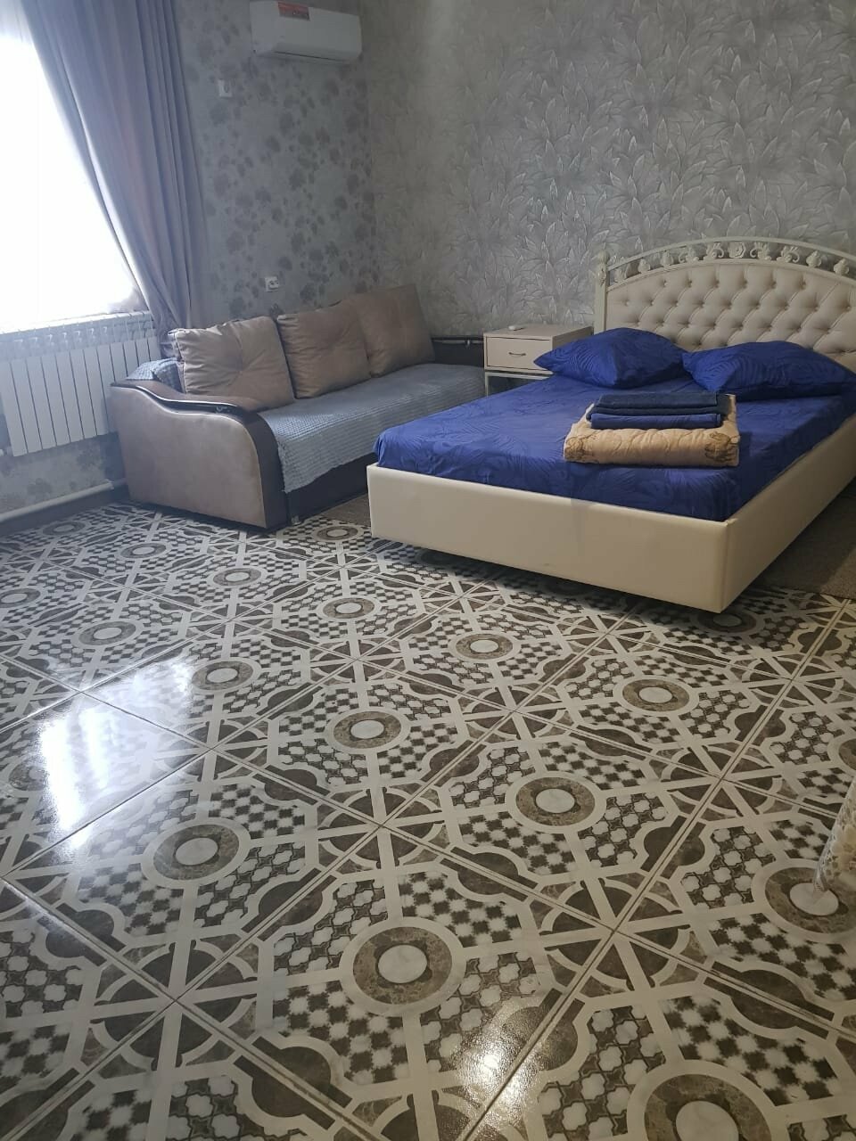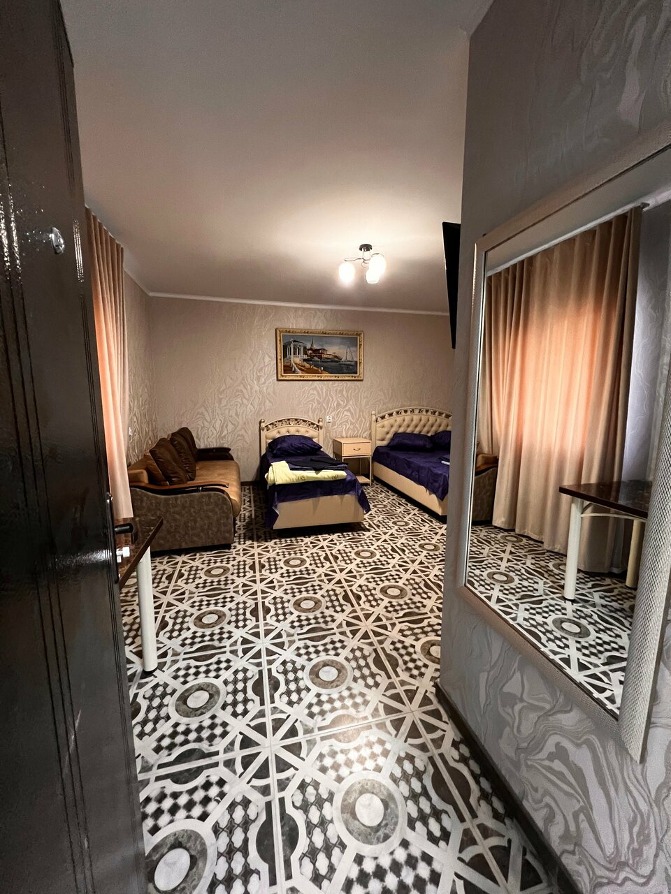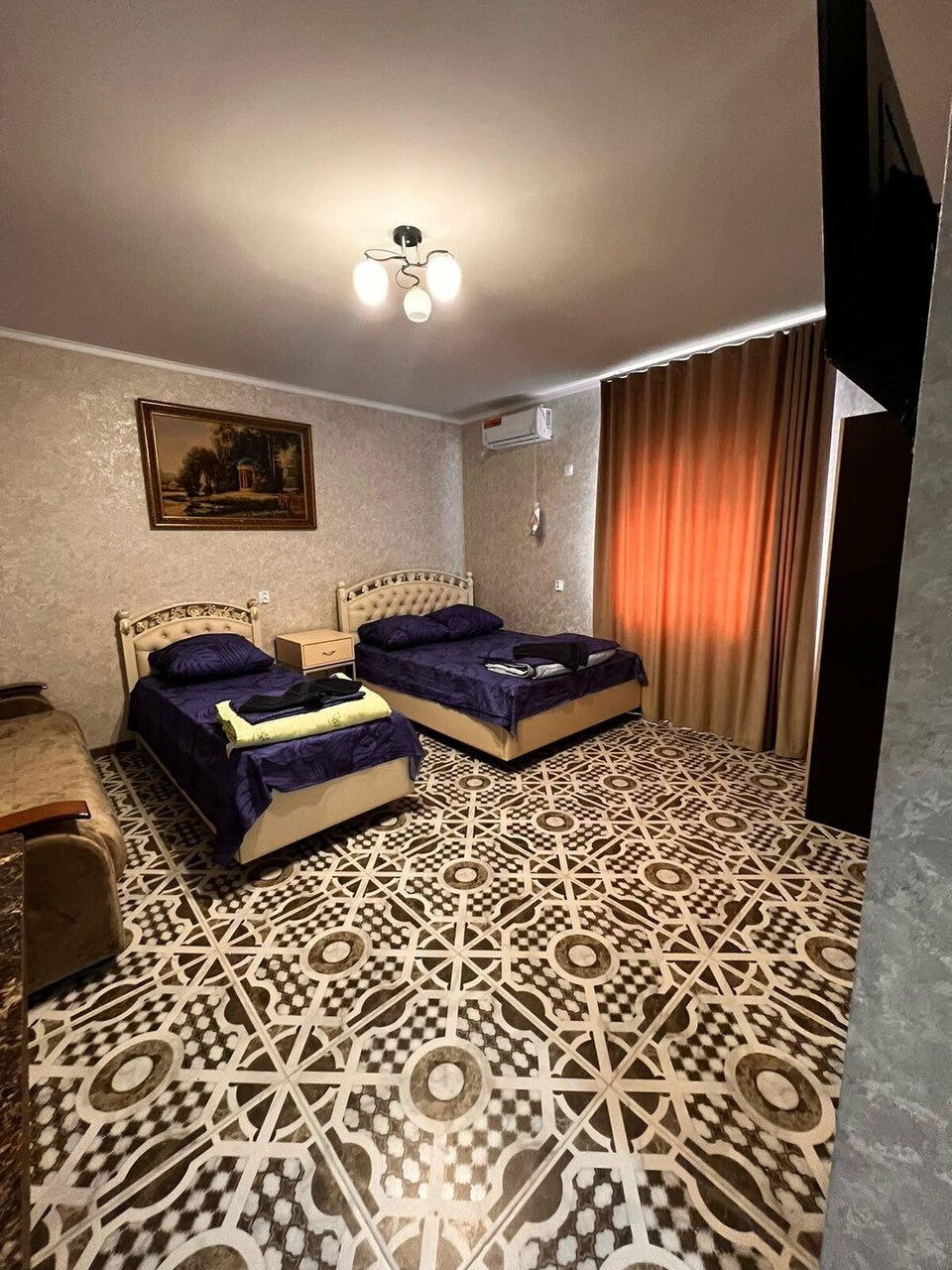 Отель только построили и ещё будут достраивать!!В номере есть всё необходимое для того,чтоб отдохнуть. Одна кровать двуспальная,новая, постельное чисто,рядом ещё одна кровать односпальная и диван,для семьи хватит. На полу плитка,душ, туалет -все чистое. Есть 4 полотенца, набор (зутная щётка и паста для каждого) 3 этажа. В общем рекомендую для остановки