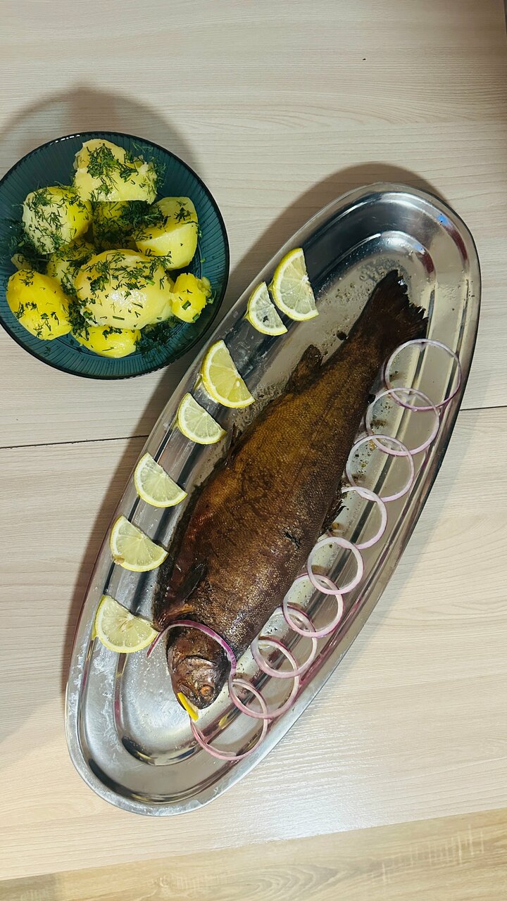Потрясающе вкусная копчёная рыба с картошечкой. Очень вкусные завтраки сам номер отличный. Всё есть: кухня, фен, телевизор и др. Тёплый пол здорово, ребёнок с удовольствием играл на нём.