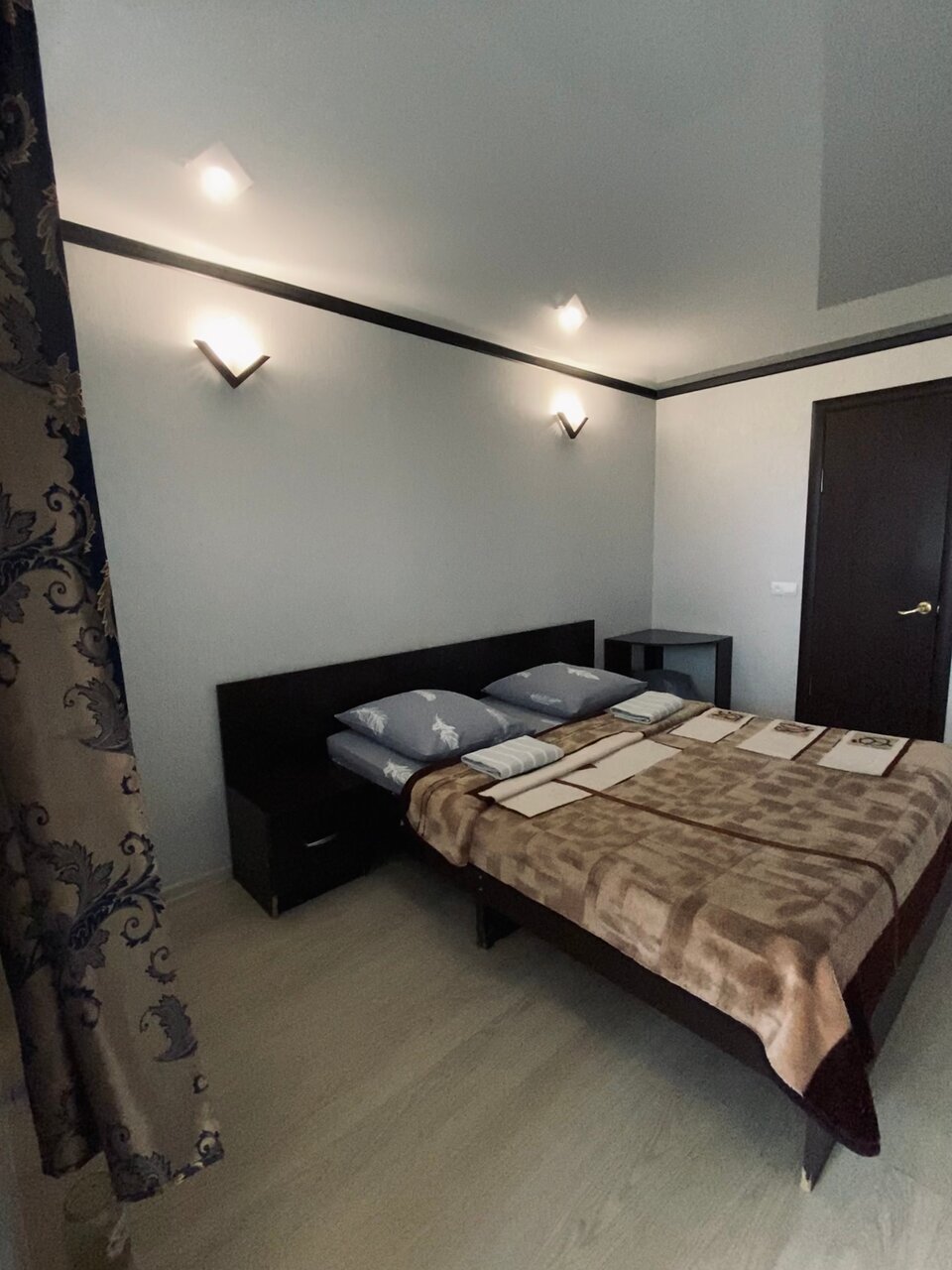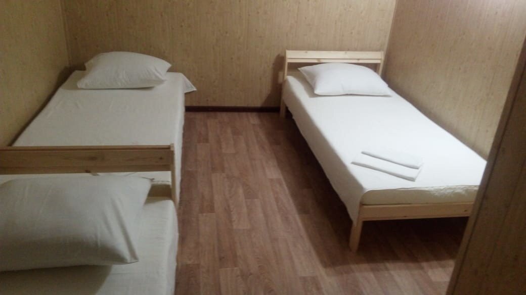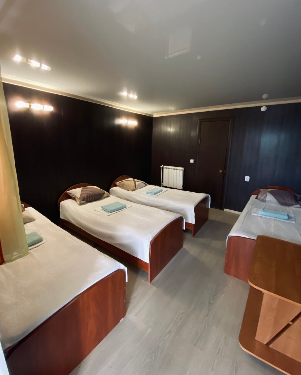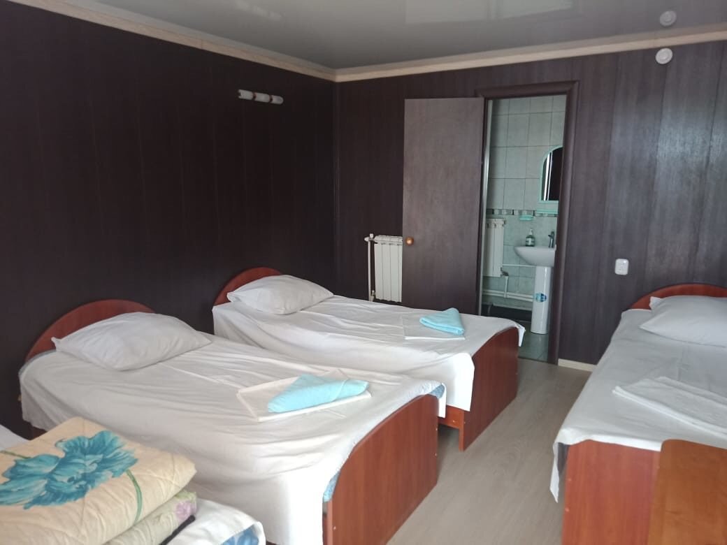 Хорошие номера, есть всё что необходимо, если успеть, то можно даже поужинать, так как при гостинице имеется кафе, бельё чистое, брал номер на четверых, кровати нормальные, так же в номере имеется кондиционер.