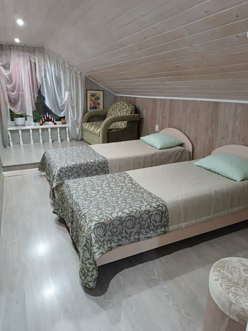 2 полутороспальные кровати, ТВ, Wi-Fi, кондиционер,шкаф,тумбочки, , холодильник, гигиенические принадлежности . Сан.узел и душ находятся на этаже