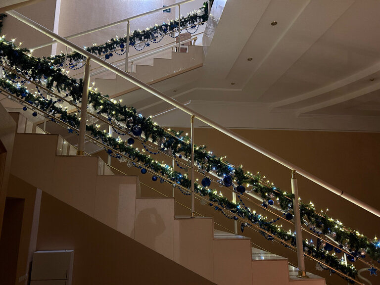 - Уютная атмосфера (высокие потолки, красивые люстры).