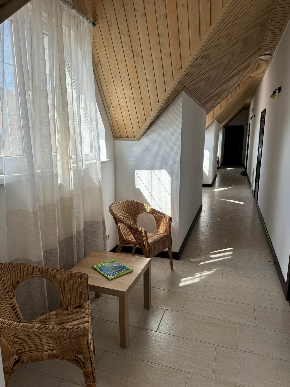 Отдыхали с семьей (двое детей). Хорошая гостиница в этом посёлке. Хозяева хорошо принимали и обо всем можно было договориться. Домашняя обстановка, домашняя вкусная еда. Небольшой уютный номер. Есть все необходимое. Чистота поддерживалась. Единственный минус, когда сильный шторм и ветер, неприятно жить на берегу.