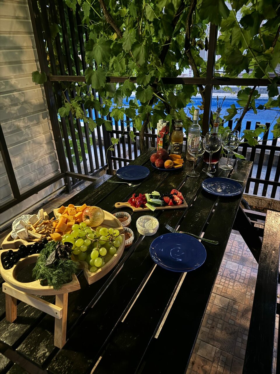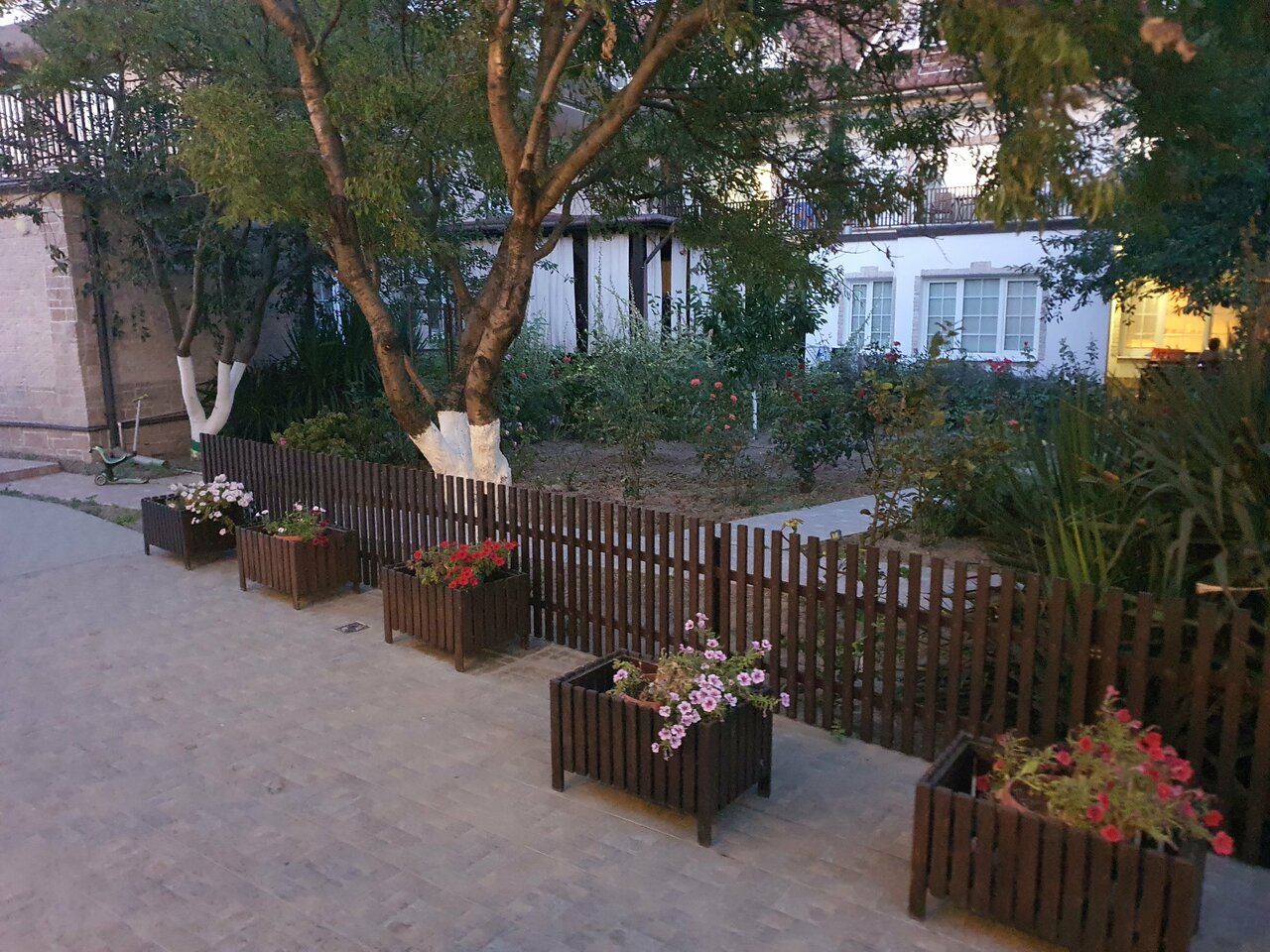 - Красивый внутренний двор с бассейном, цветами и виноградными лозами.