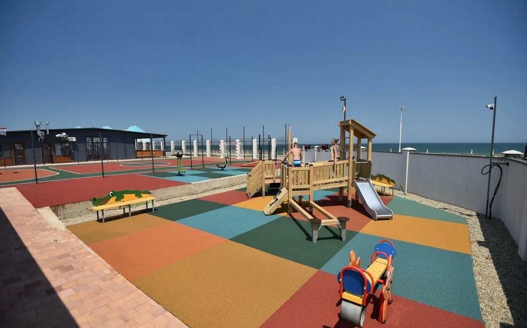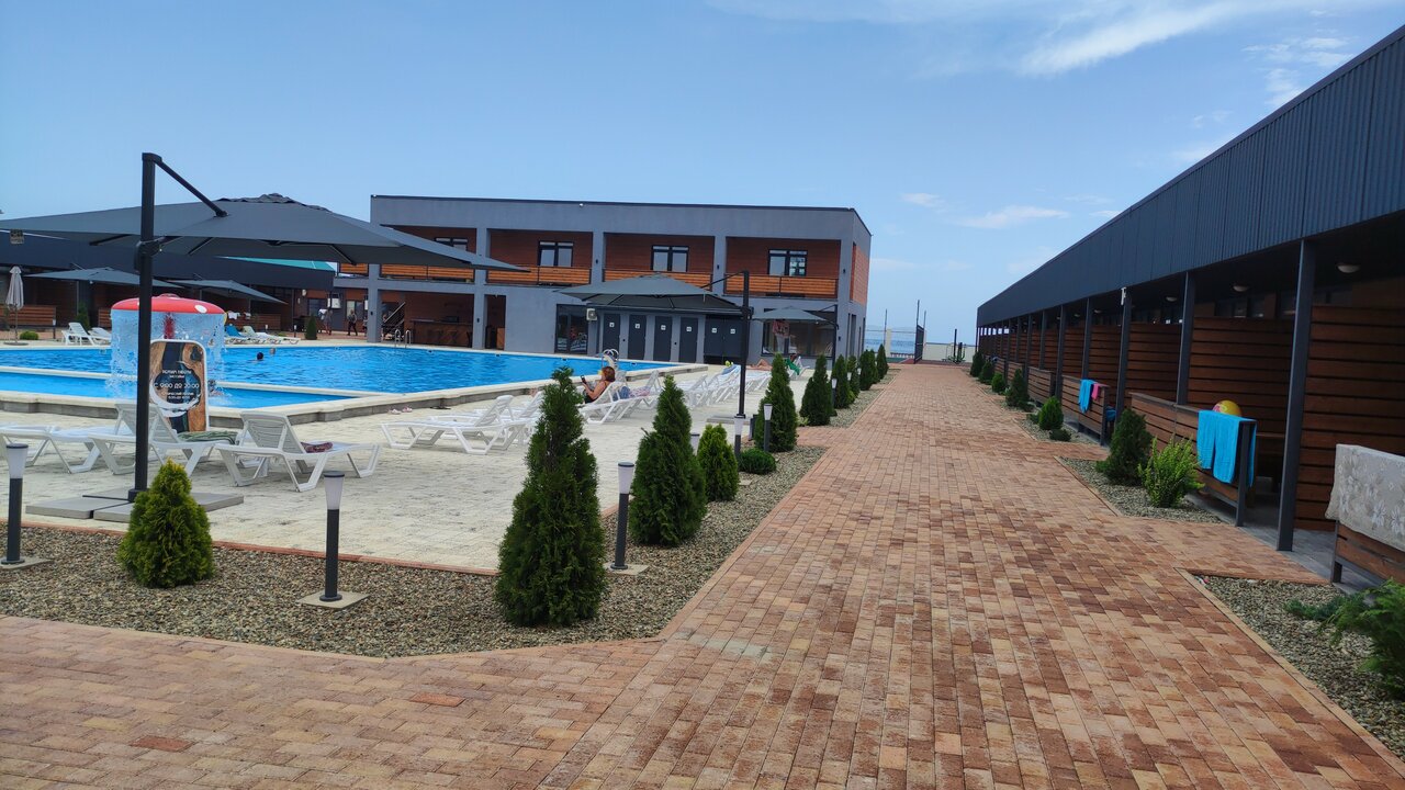 Расположен рядом с морем, удобный спуск с коляской. Большой паркинг для автомобилей. С веранды столовой открывается отличный вид. В целом отель очень хороший, большой бассейн, шезлонги, зонтики. Открылся бар, цены очень демократичные, правда закрывается в 20:00. Вкусная столовая. Хорошие номера, с современной оснасткой. Wi-Fi слабоват. Не ловит от слова совсем дальше административного здания. Хромает обслуживание номеров. Довольны отдыхом! Даже при полном заселении отеля, не чувствуется давки. Просторная территория, спортивная и детская площадки. Рядом рынок и магазин Магнит в 10-15 минутах ходьбы. Завтраки по системе Все включено однообразны, но не разочаруют вкусом и качеством блюд. Не стал бы называть альтернативой Турции, но все очень достойно, атмосфера располагает к релаксу. Единственное, что беспокоит, сцена детского лагеря. Ежедневные тусовки до 23:00.