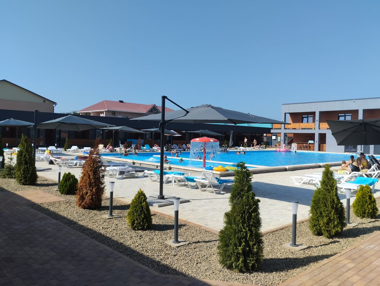 Восторг! Чистые новые номера, отличная столовая, тёплый чистейший бассейн, первая береговая, дискотеки для малышни вечером. У каждого номера своя веранда. Всегда есть свободные лежаки у бассейна. Сауна с панорамными окнами.