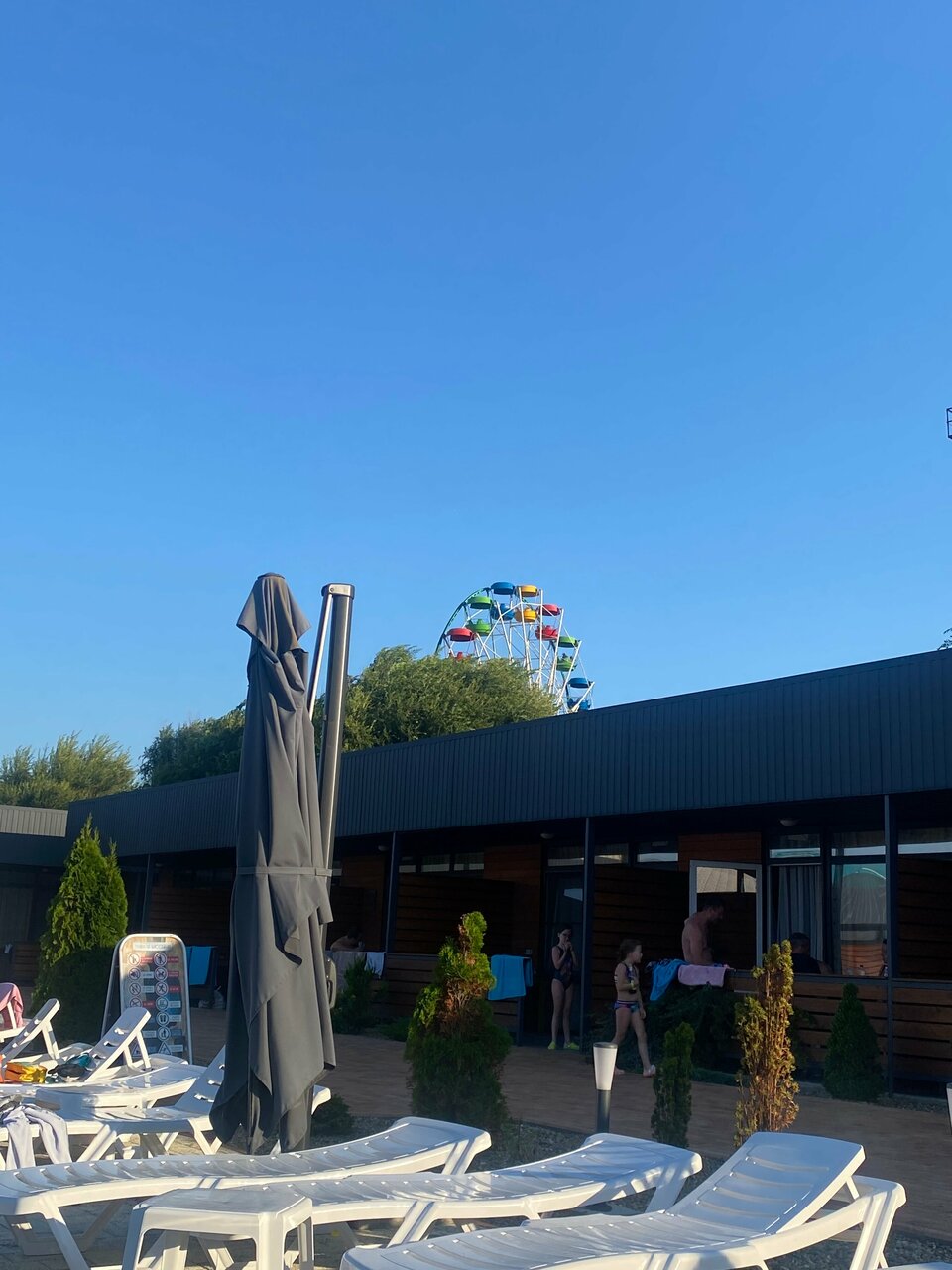 Били гостями у босеина в этом отеле 31 июля . Настроение от отдыха было испорчено из за одной вредной гостьи этого отеля . Она закрыла зонт не смотря на безветренную погоду и открытых 12 других зонтах и наши девочки были вынуждены сидеть под палящим солнцем . Администрация вместо того чтоб предложить своей гостье перелечь на шезлонг без зонта , проигнорировала нашу просьбу открыть зонт для детей . Это просто хамство . Нужно уважать всех своих гостей и уметь урегулировать ситуацию в пользу всех . Ушли как оплеванные , дети обгоревшие . Вы или купите не сдуваемые ветром зонты или эти закрепите надежно . Для чего они у вас стоят если ими нельзя пользоваться ?