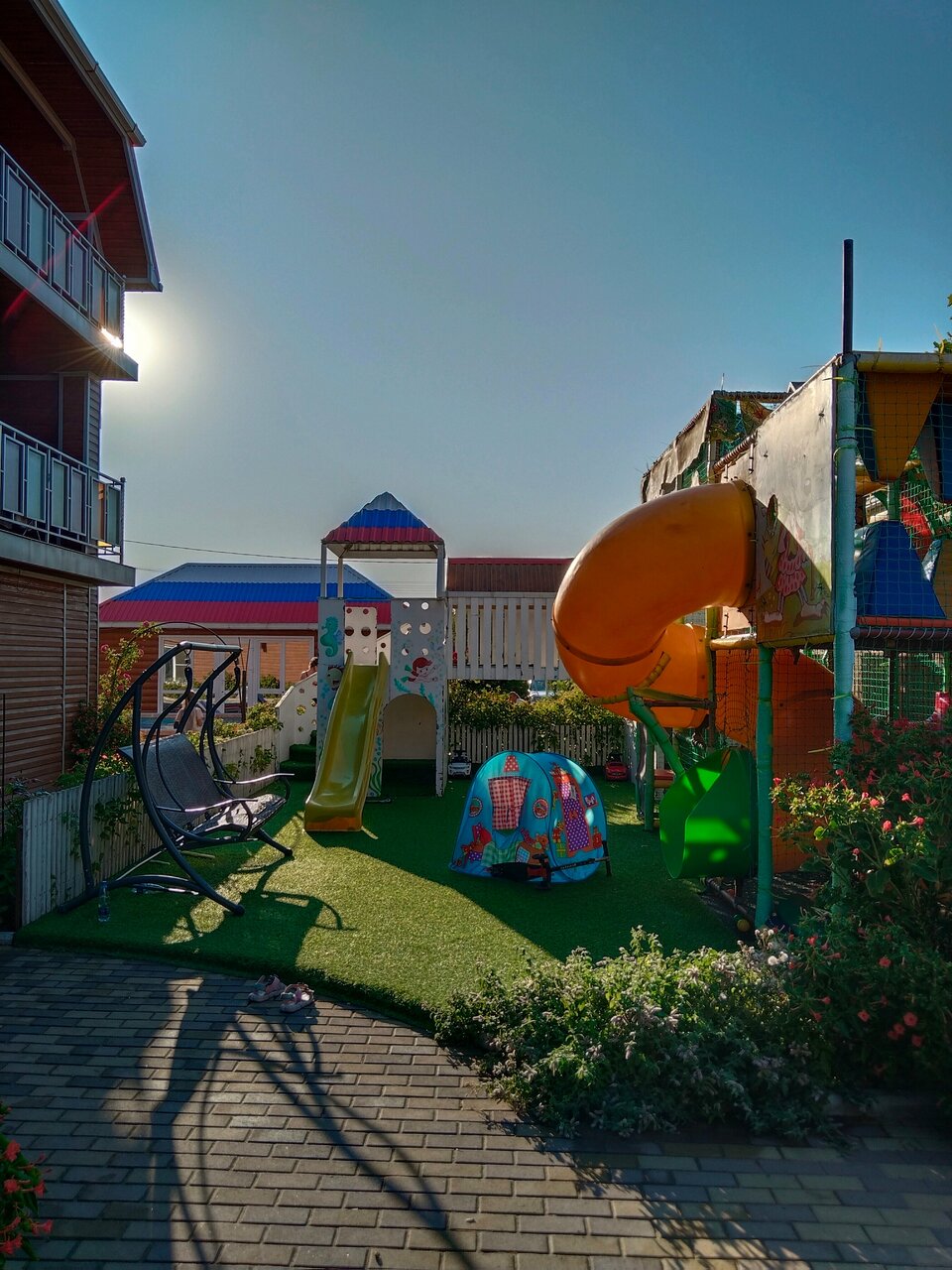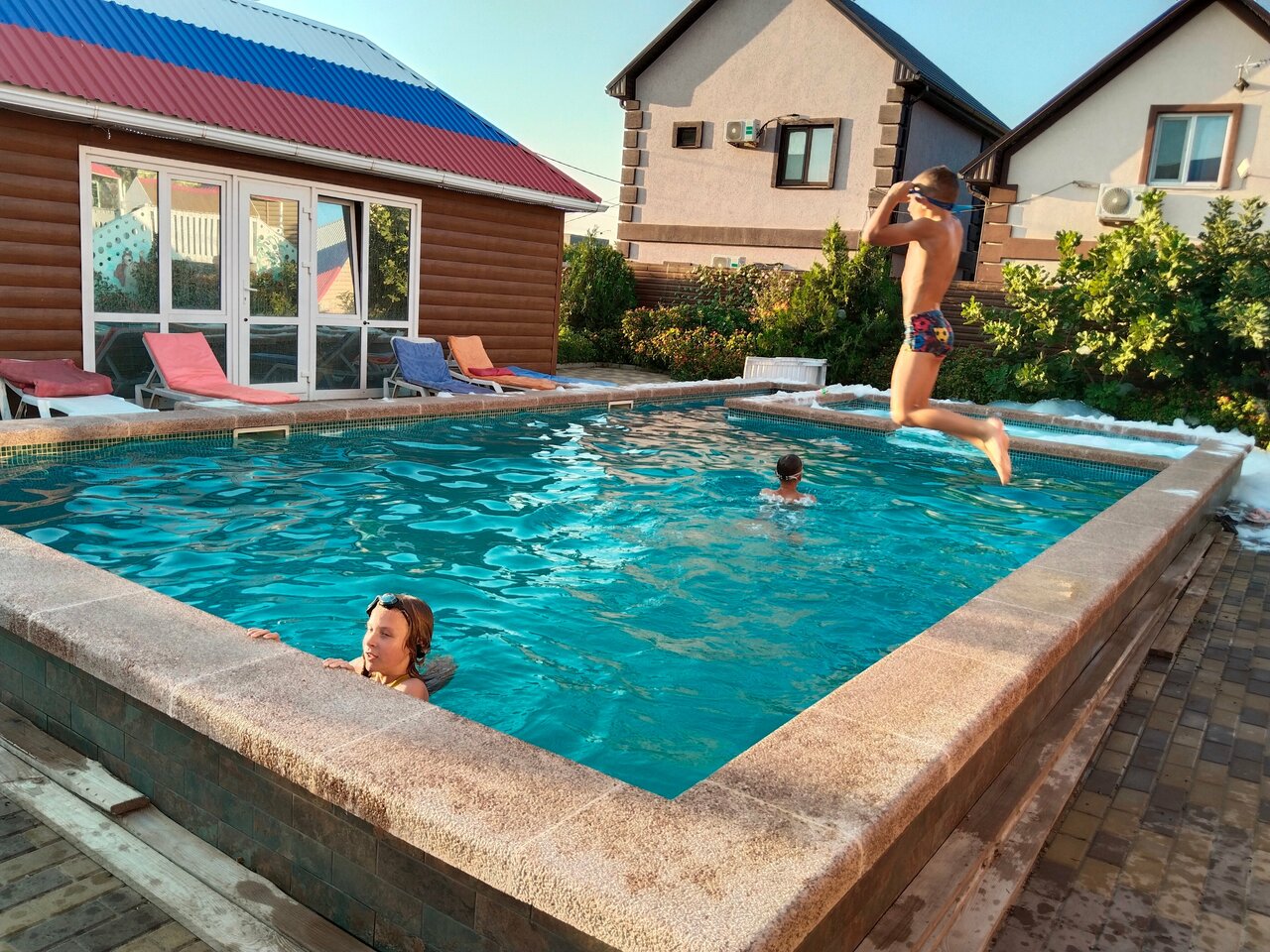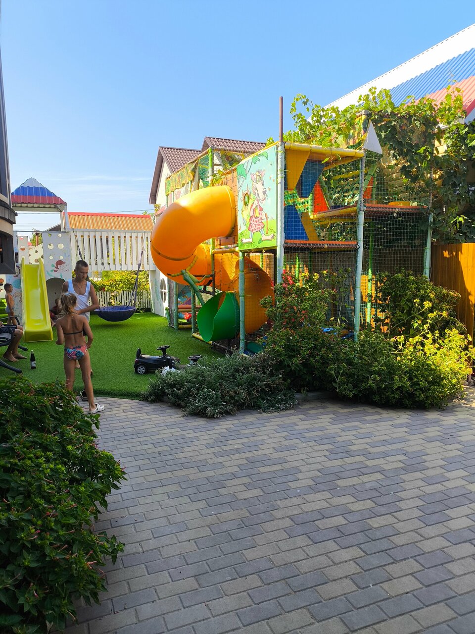Лучшее место! Собираются в одном месте несколько многодетных семей, все разновозрастные дети находят себе компанию, играют целый день на свежем воздухе, на территории гостевого дома — на детской площадке, в игровой комнате, на батуте, в бассейне, а родители в это время отдыхают от детей 🙂 Ну, у бассейна надо за детьми приглядывать — или на шезлонге, или плавая рядом, и на море надо вместе ходить, а остальное время дети отдыхают сами. Лучший отдых! Все на территории есть, все бесплатно, все душевно! Море теплое, песок мягкий, ночи темные и тихие… Три года сюда ездим, приедем и еще.