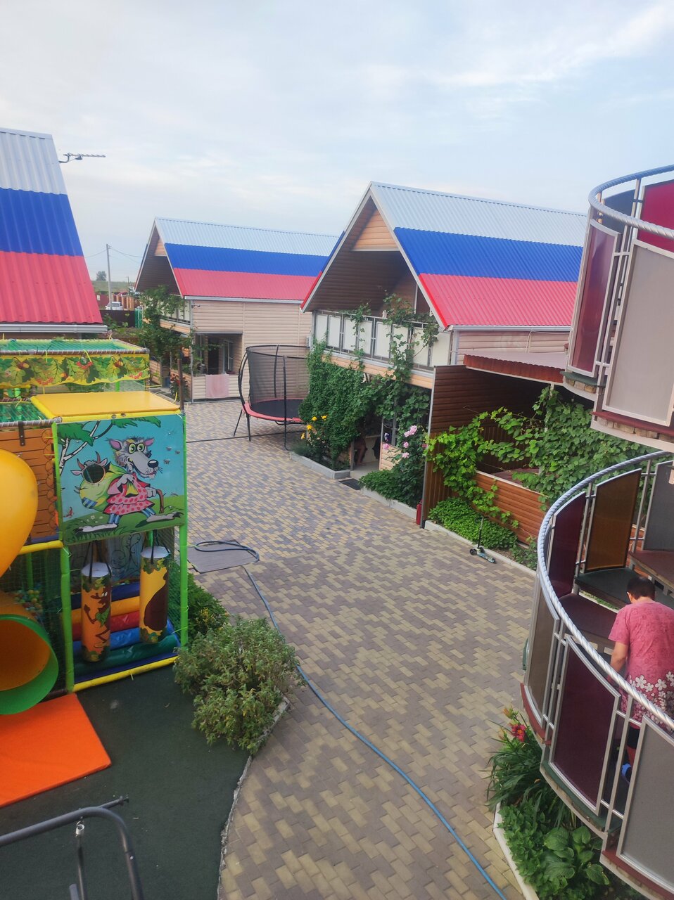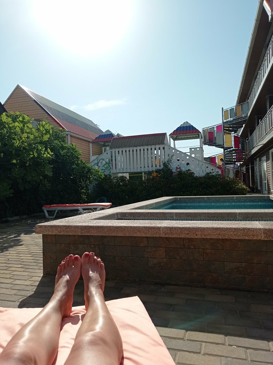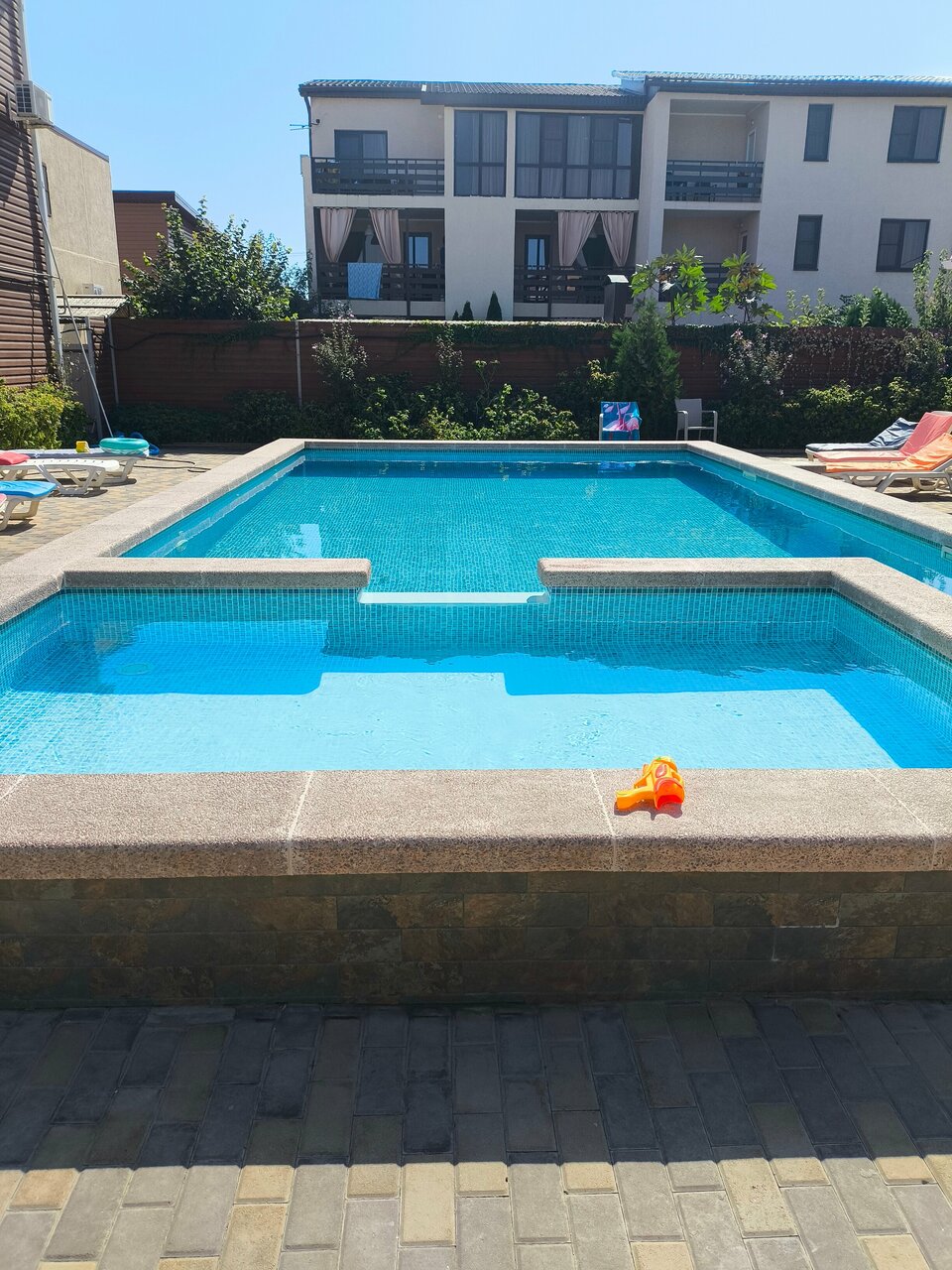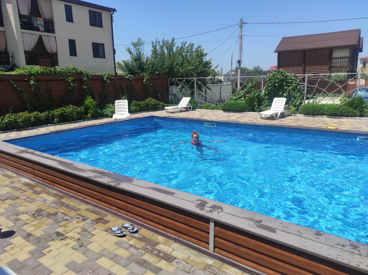 Договаривался заранее с Анатолием в январе месяце на конец августа. Сделал предоплату за оди сутки. Ни каких изменений по оговоренной сумме спустя 7 месяцев не было. Приехали, наш котетж уже нас ждал. Сразу заселились. Анатолий все показал и в ходе отдыха помогал решить ряд текущих вопросов. Огромная ему благодарность. Очень гостеприимный! На территории все так как и рассказывал Анатолий. Бассейн на 5! Чистый и ухоженный!!! Море в 5 минутах если маленький ребёнок идёт сам. Пляж достаточно чистый, но развекадовок там нет. Магазины в посёлке есть ни куда далеко ехать не надо. Территория небольшая, но огороженная. С парковкой проблем не было (бесплатная) у отеля. Для отдыха с детьми очень хорошее место!