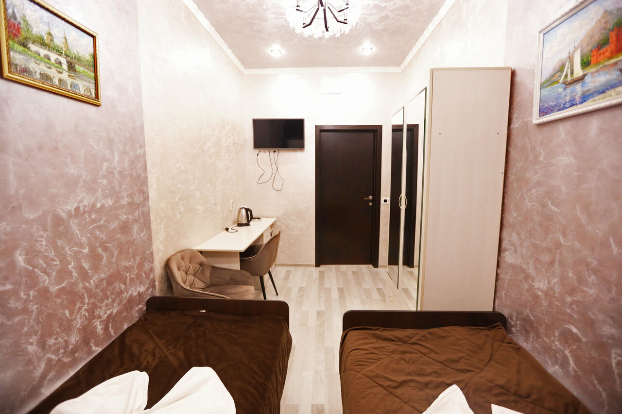 Забронировали номер на ozon,поднялись в номер,а там три отдельные кровати,удобства на этаже,а стены ужасно грязные ,измазанные неизвестно чем.На этаже вонь,в душе грязь,углы с плесенью.Попросили другой номер,доплатили ещё тысячу,удобства в номере,маленький номер,матрас ужасный,каждая пружина вписалась в бока,за ночь не отдохнули совсем, вонь,душ так же не внушает доверие.Никому не советую к посещению эту гостиницу,если бы можно поставить ноль в оценке,поставили бы ноль.в кафе интерьер ужасный,кормят вкусно, покрайней мере заказали шашлык и пиццу, замечания нет, вкусно!