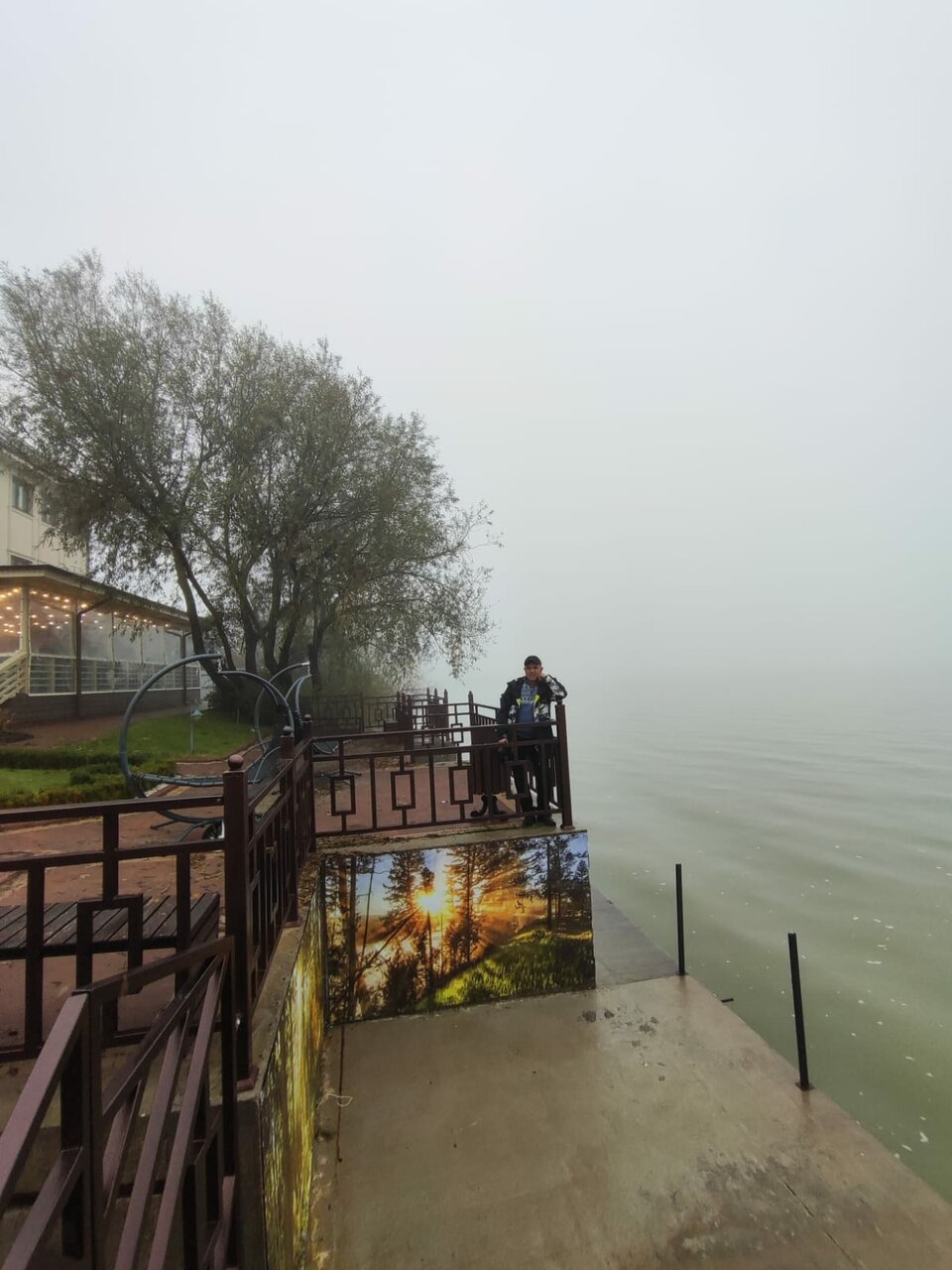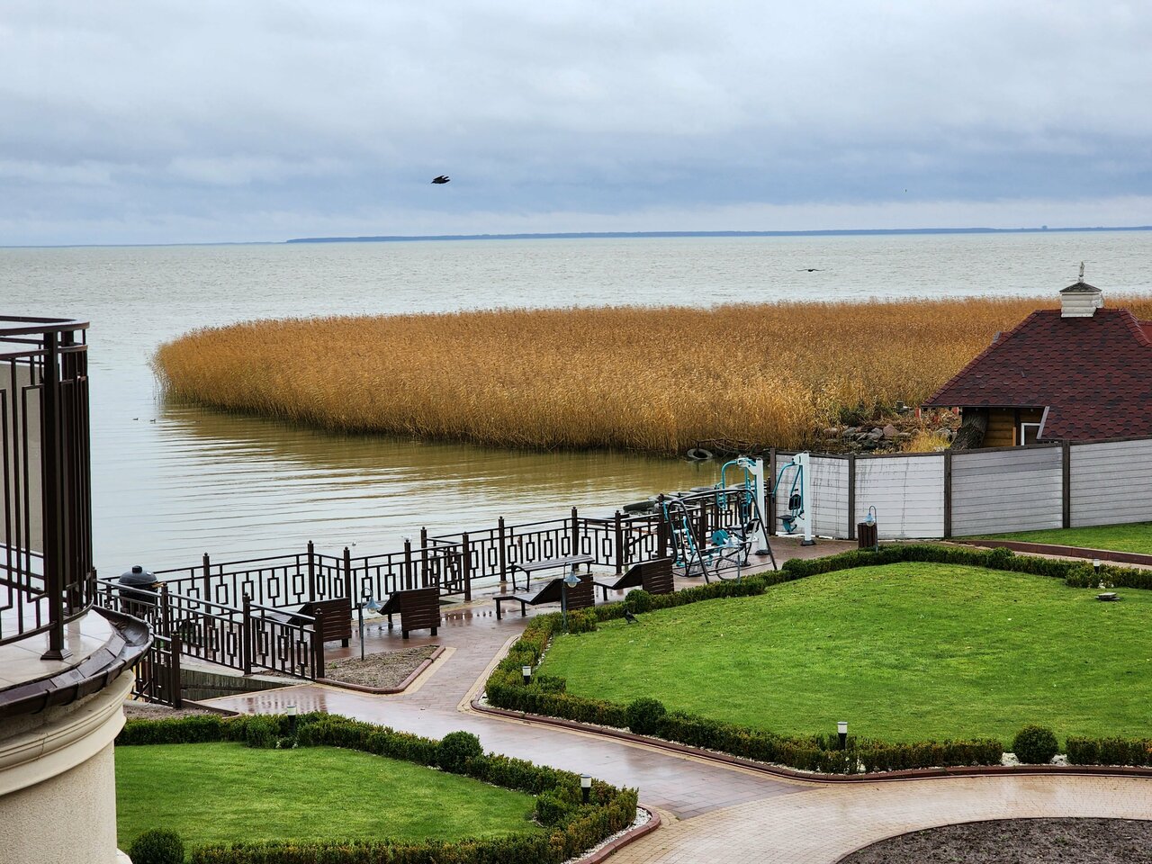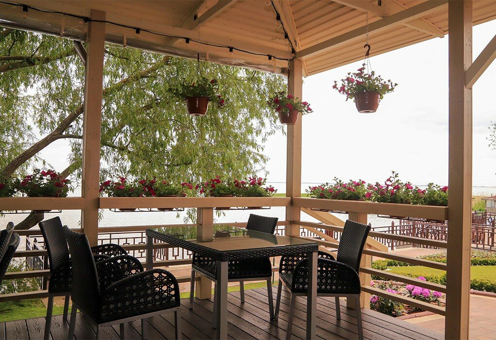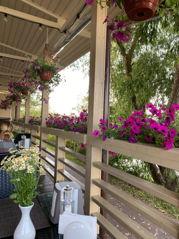 Удивительный вид на залив с утками, лебедями и бакланами. Живая музыка в обед. Оборудование весьма новое. Обслуживание без проблем.