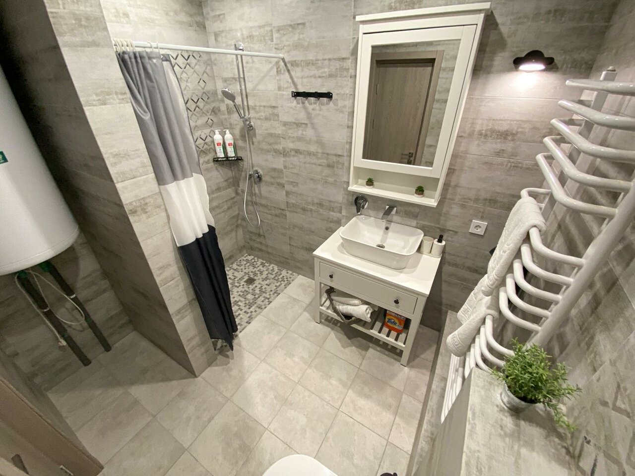 - Чистая ванная комната с косметическими средствами.