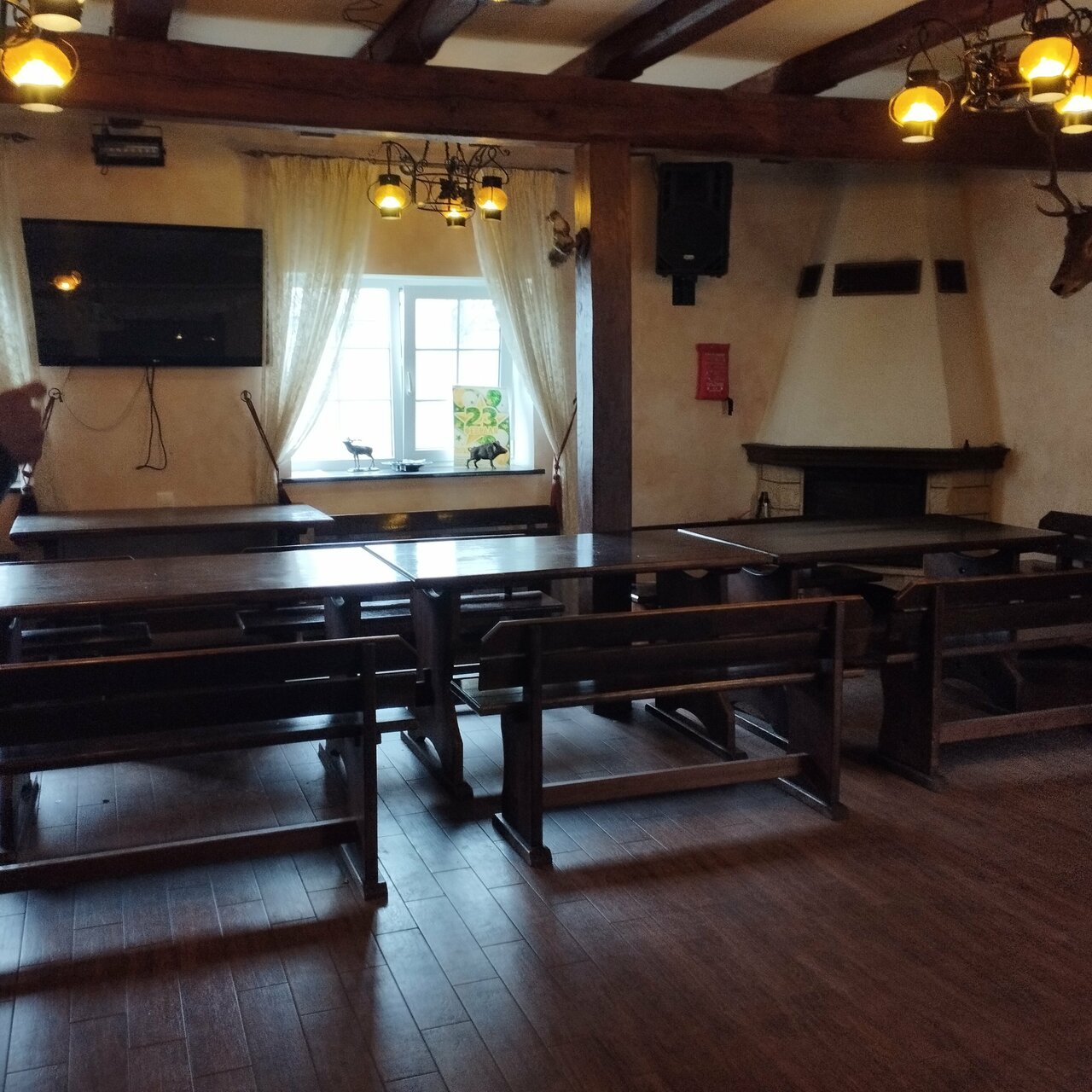 Отдыхали здесь большой компанией, 37 человек включая детей. В основном доме большой зал с камином, где мы все собирались и кушали. Хорошая кухня, посудомойка, очень много посуды и стол.приборов, прям порадовало. На территории есть еще отдельные домики, баня, отдельно игровая — настольный теннис, воздушный хоккей, бильярд.