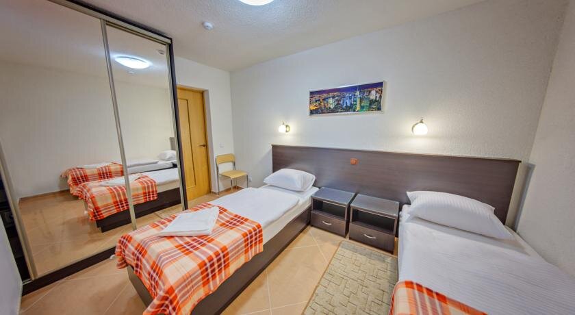Ставлю четыре звезды только за отсутствие кондиционеров. В целом отель хороший за свои небольшие деньги. Все номера выполнены с одним дизайном в одной цветовой гаммой , кухня гостиная санузел ,студия. Вся посуда на три человека. Цветной жк телевизор, чайник, холодильник, плита. Очень вместительный шкаф купе. Электра-плита. Окна в номере выходили на частный сектор симпатично . Транспорт без проблем довезет в любую точку маршрута. Персонал приветливый! Утюжить вещи в прачечной без проблем, фен если попросите предоставят. Предоставляют прокат авто. Да конечно не центр но за свои деньги четыре заезды .