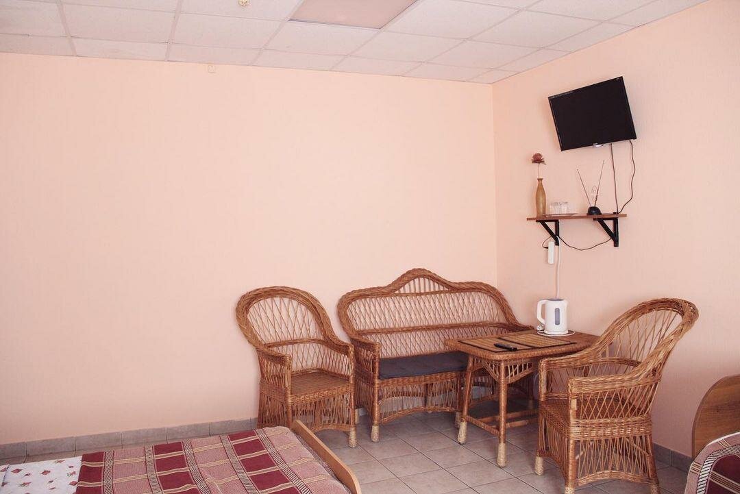 Номер с удобствами,холодильник,чайник,сплит,рабочий телевизор-все необходимое есть.Чисто, аккуратно, уборка ежедневно. Вежливый персонал. В гостинице кафе, где можно позавтракать, пообедать и поужинать. Блюда все вкусные, как домашние. Отличная гостиница.