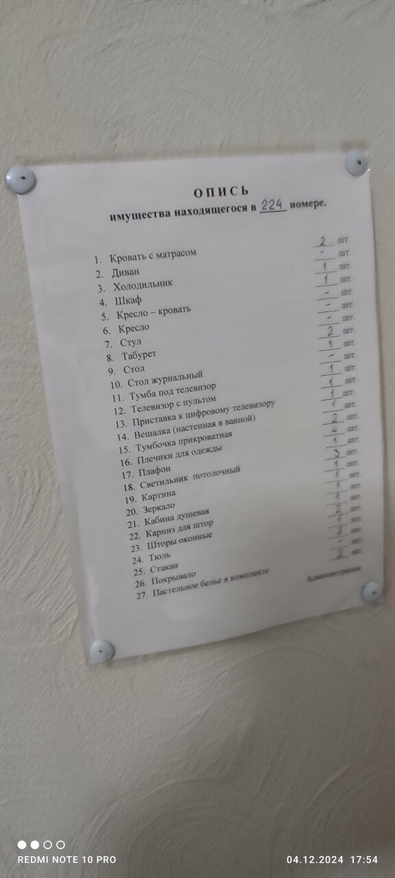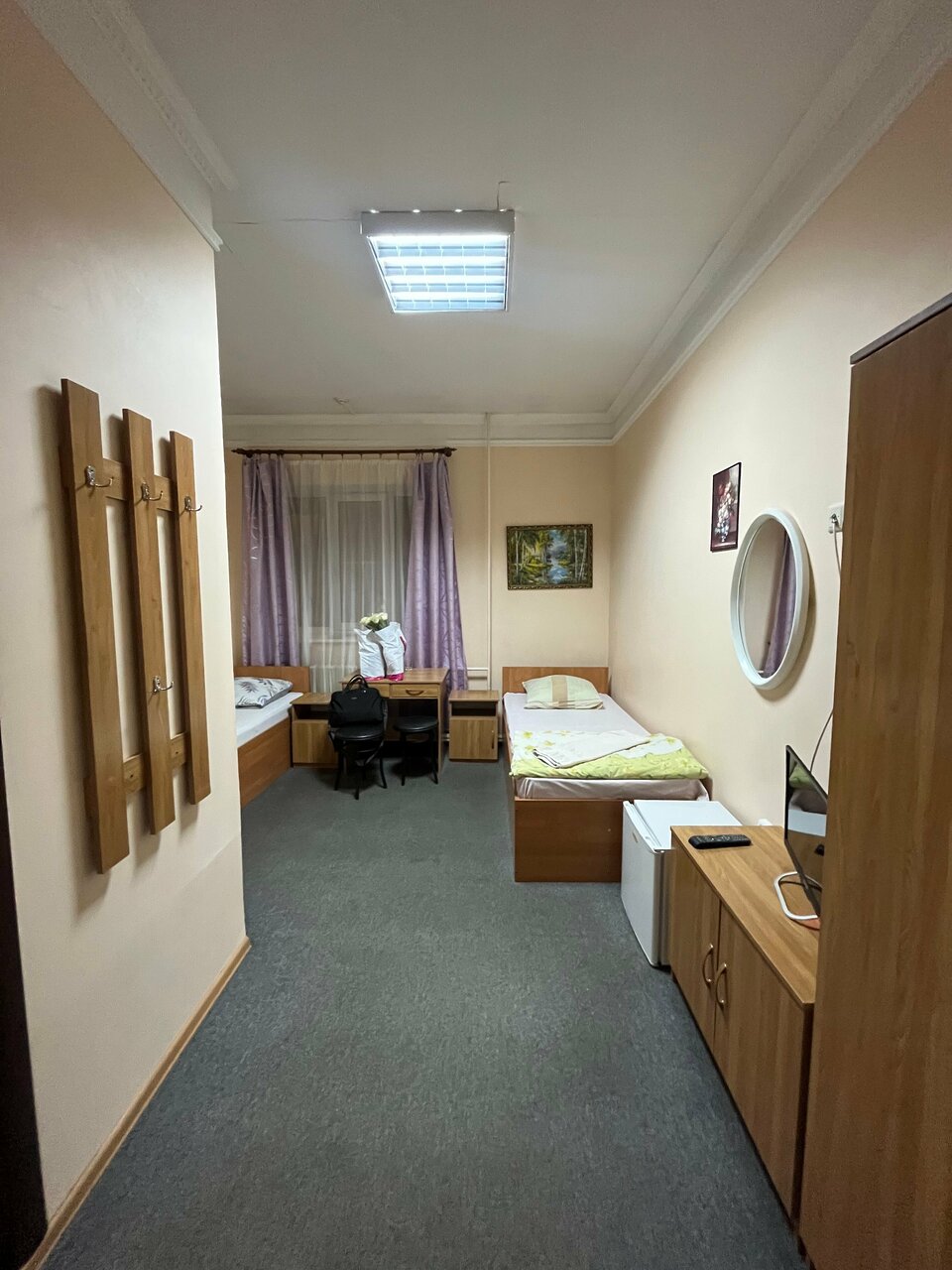 Провел тут всего сутки, но отзыв будет объективный. Очень понравился отель! В номере очень чисто и есть всё необходимое(постельное, полотенца, холодильник, телевизор, зеркала, шкаф, туалет, душ…) В посещении столовой не было необходимости, поэтому отзыв по питанию оставить не могу. Персонал отзывчивый! В 5-ти минутах ходьбы спокойным шагом большой супермаркет.