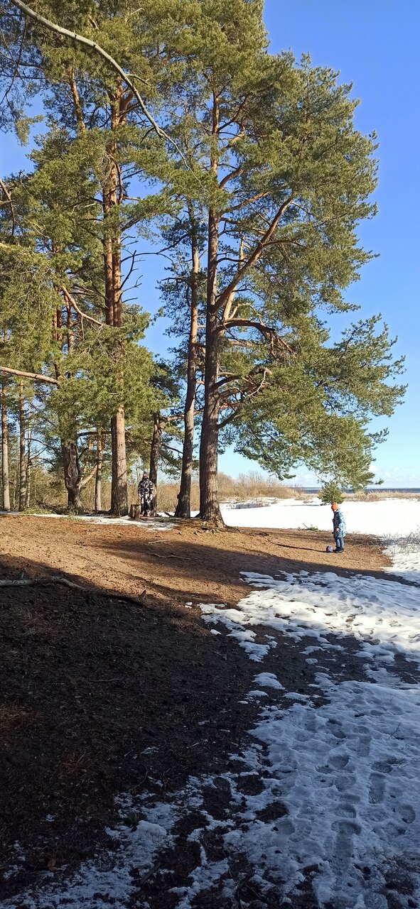 - Большая территория, сосны, песчаный берег.
