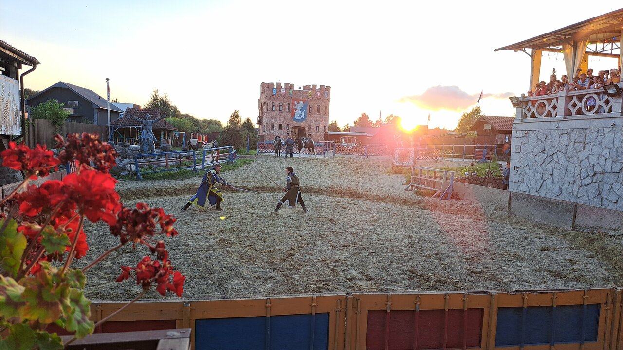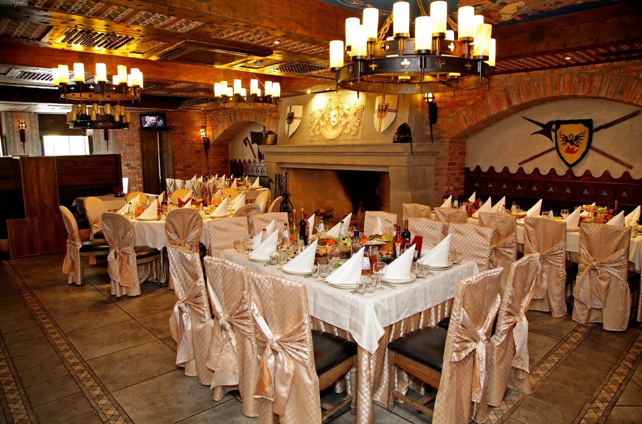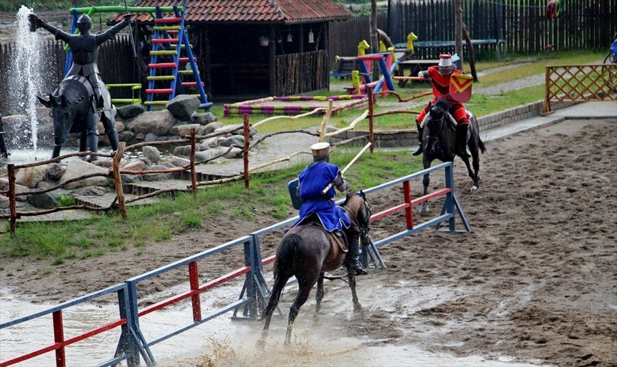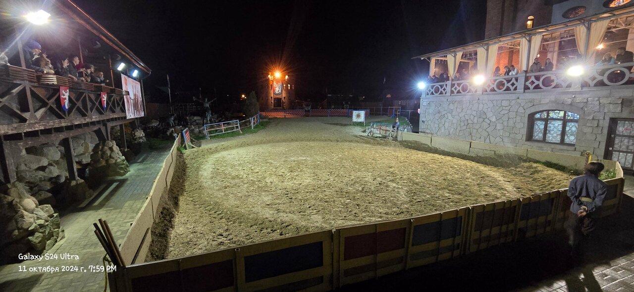 - Ламповая атмосфера.; Отличное место, интересная локация.; Крутая атрибутика замка.; Внешний и внутренний вид замка впечатляет (средневековый стиль, рыцари, мечи).; Возможность покататься на лошадях.