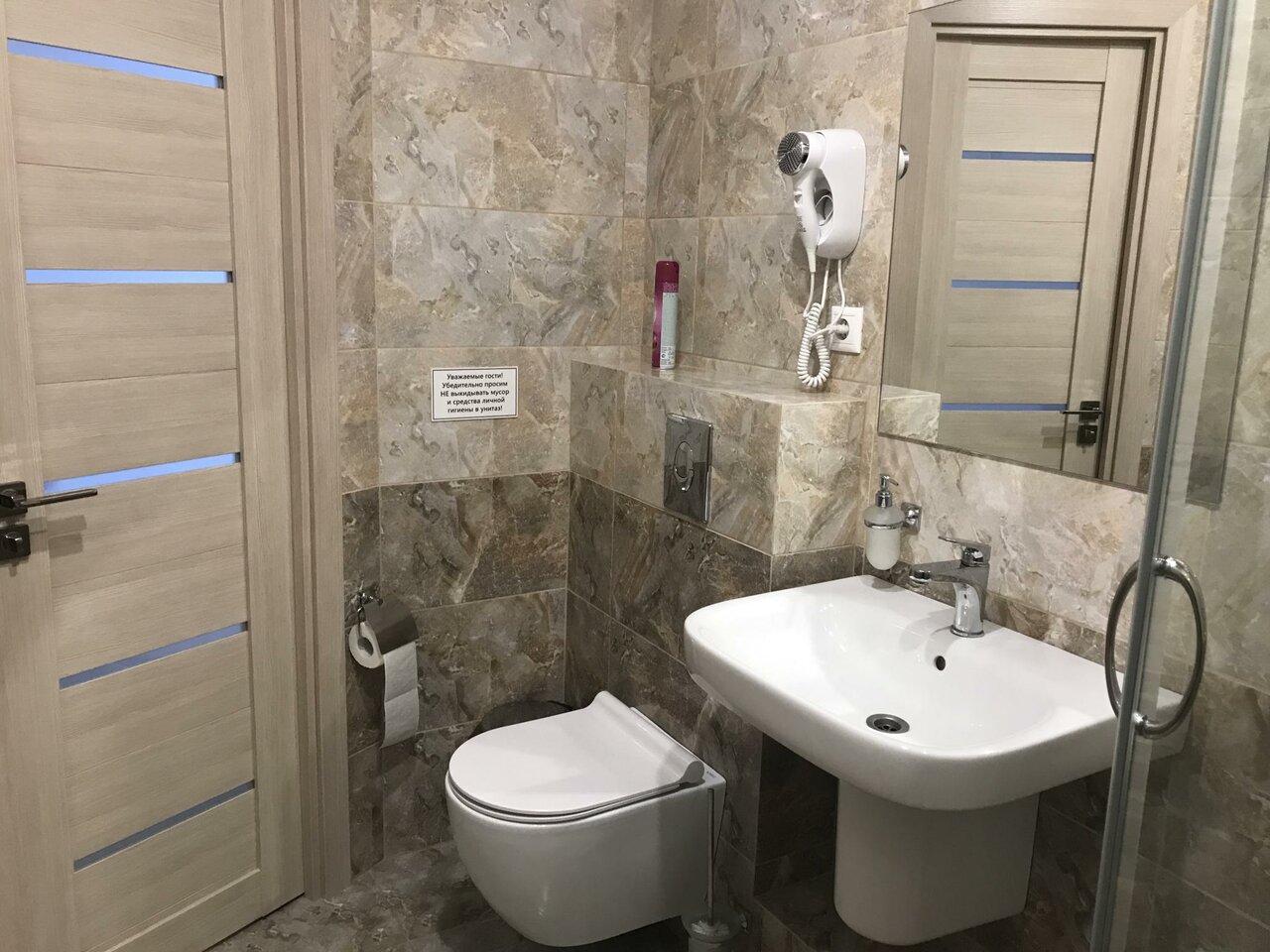 Проживали с семьей в 4х местном номере эконом класса. Но, сам номер оказался на очень высоком уровне — огромная удобная кровать, широкий разборный диван. Доже телевизор с мини домашним кинотеатром. Так же в номере был кондиционер. Туалет и душ в коридоре, общие, но в них идеальные чистота и порядок. В номере были одноразовые тапочки, что очень удобно). Гостиница стоит боком к трассе, машин практически не слышно, Отдохнули и выспались отлично. Очень доброжелательная администратор, узнав что приедем поздно ночью, разобрала и застелила диван для детей заранее. Впечатлил обстановкой ресторан на первом этаже. Завтрак был горячим и вкусным. Очень достойная гостиница, самые лучшие и положительные впечатления!