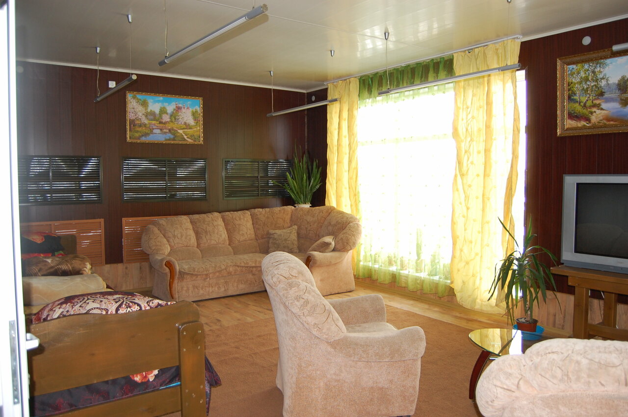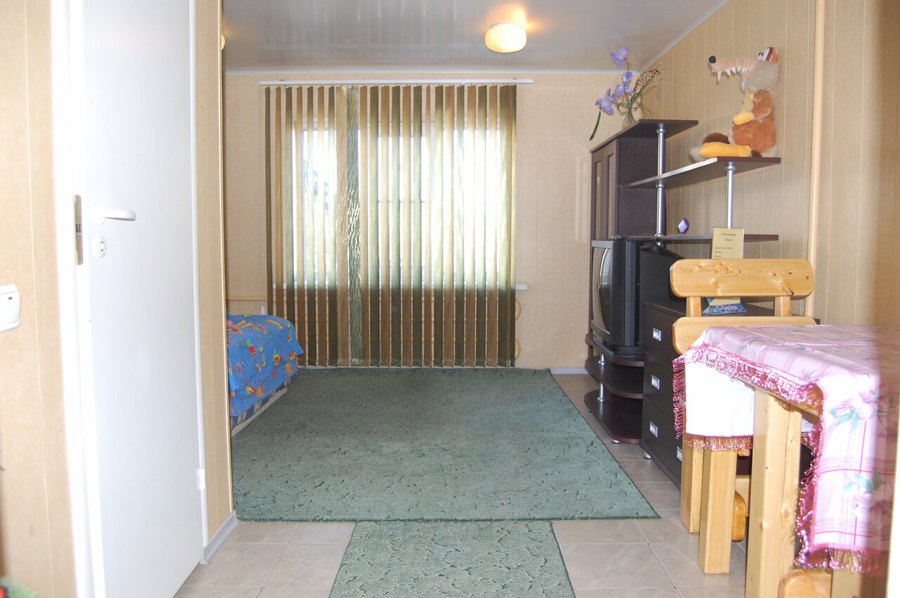 Заказывали номер на двух взрослых и трёх детей — комната # 11. В номере: огромная комната (две односпальные кровати и два раздвижных дивана), кухня небольшая, столовая комната, туалет, душевая. Телевизор, окна в пол, кондиционер. Не понравились два момента: в кухне грязно, посуда не мыта и душевая как в спортзале. В общем и целом номер достойный для отдыха. Стоимость с человека по 1000р. Но за детей скинули стоимость. Итого — 3500р