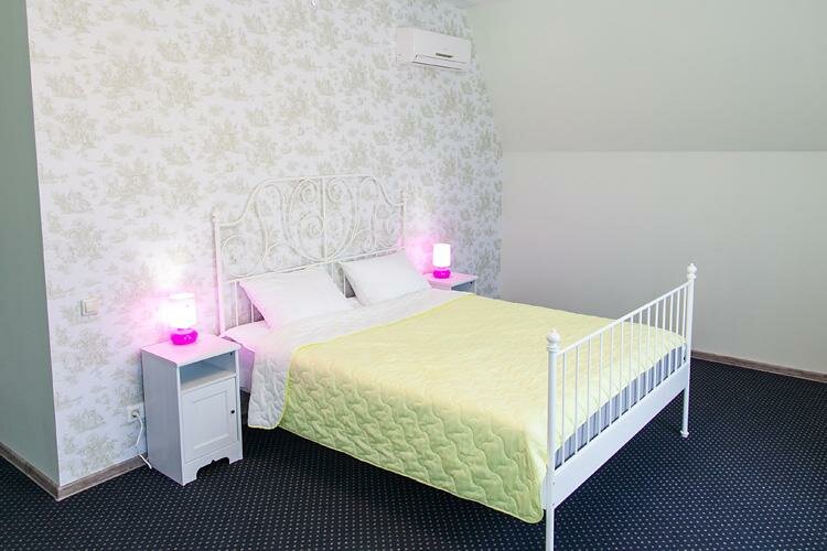Расположение удобное: съезд с трассы и выезд на неё без проблем. Нам досталась просторная комната в мансарде в стиле Прованс, двуспальная кровать, диван раскладной и кресло. Чисто. Заехали около полуночи без проблем. Внизу кафе, позавтракали сытно и недорого. Ну, и то, что порадует маленьких гостей: на входе встречает котёнок с улицы Лизюкова:)