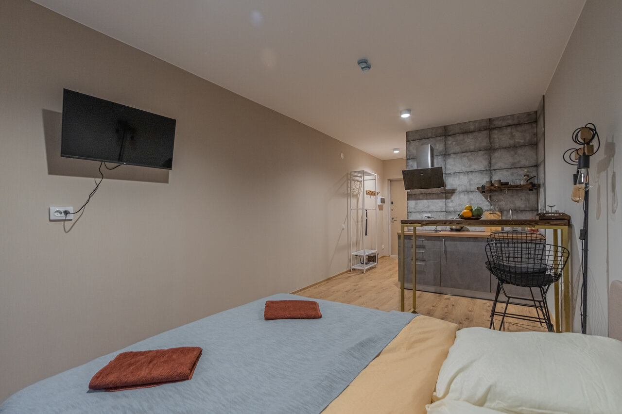- Наличие всей необходимой бытовой техники (кровать, телевизор, плита, стиральная машинка, душ).