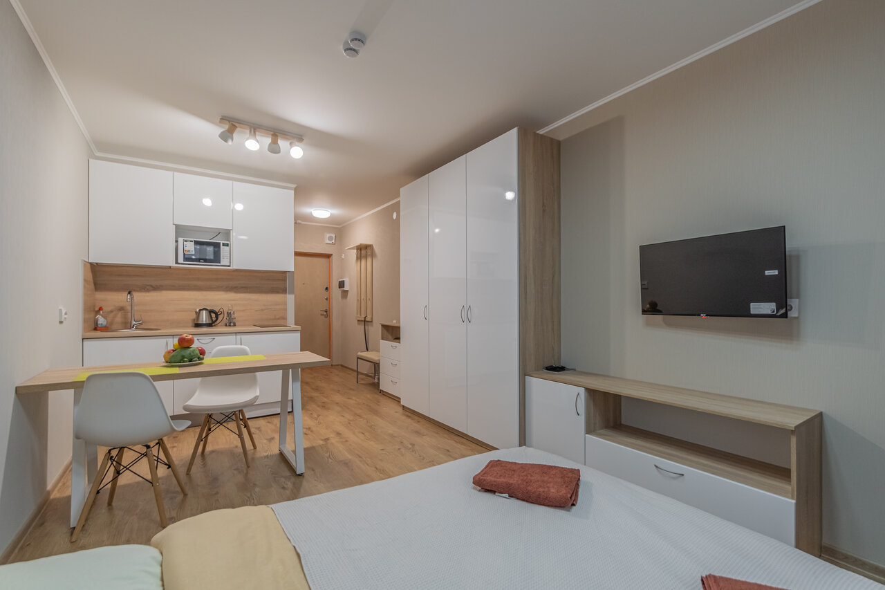 В принципе — всё есть для жизни. Кровать ,телевизор, плита, стиральная машинка, душ и другие бытовые вещи присутствуют. В самом здании есть тоже всё ,что нужно — от аптек и кафе ,до парикмахерских и фитнеса. Из недочётов — это то ,что отсутствуют сушилка (обычная ,куда можно развесить одежду), утюг и гладильная доска. Не работают и прикроватные светильники. Есть небольшая обшарпаность у окошка, но на герметичность окна не влияет (и это не недостаток). В целом — отличные апартаменты для жизни. Сотрудницы администрации вежливые и приветливые.