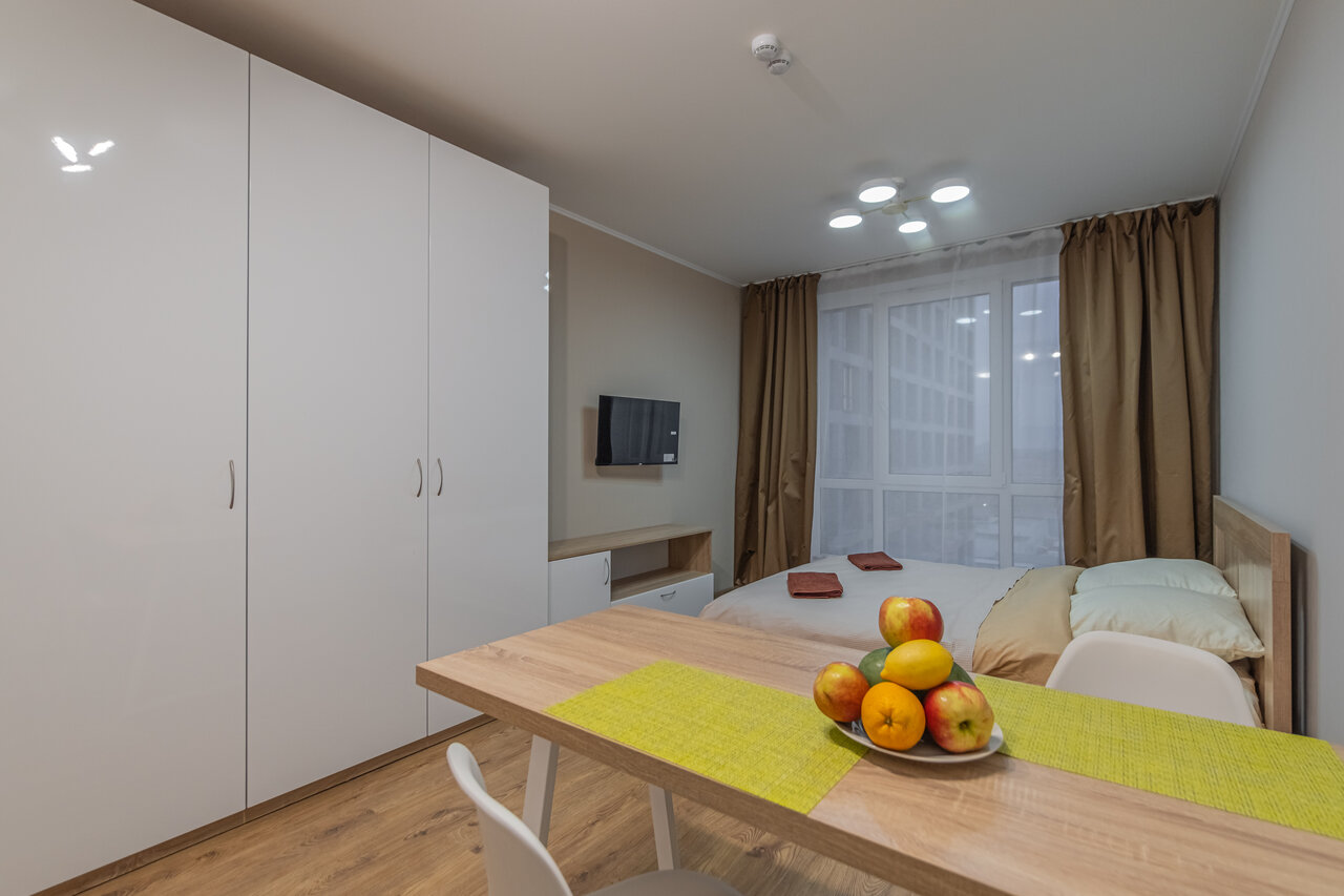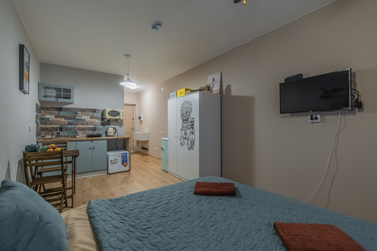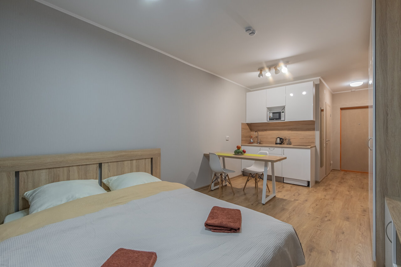 - Все необходимое в номере есть.; Возможность позавтракать и поужинать рядом.; Рядом супермаркеты ("Лента", "Перекресток", "Магнит", "Улыбка Радуги").; Приветливый персонал.; Удобное дистанционное заселение и выселение.