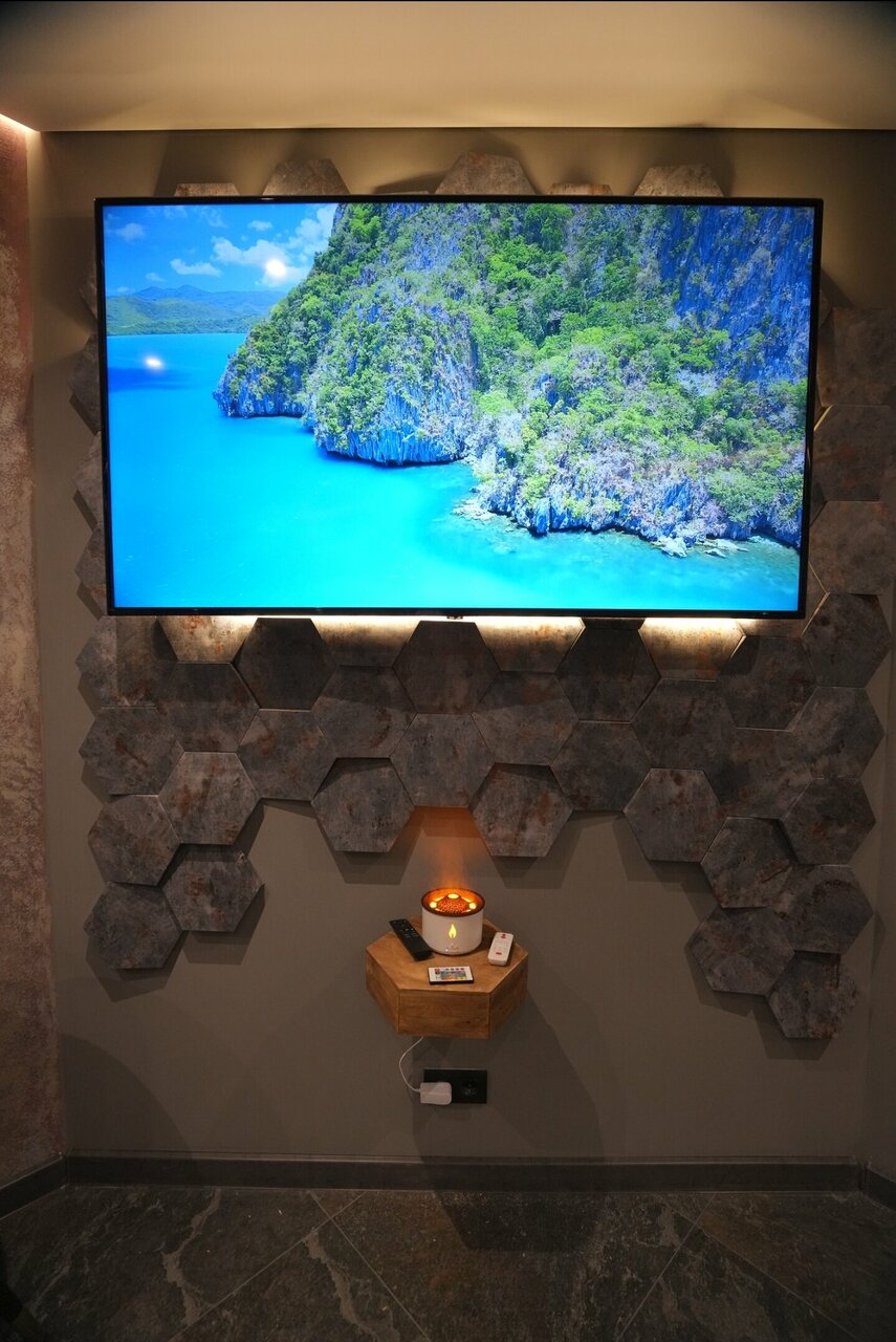 Все супер! Очень красивый дизайн, рядом магазины, кафе, рестораны. Супер что джакузи на против огромного телевизора, можно смотреть фильм прям от туда) Отдельный + за вино и другой презент при заезде. Все понравилось!
