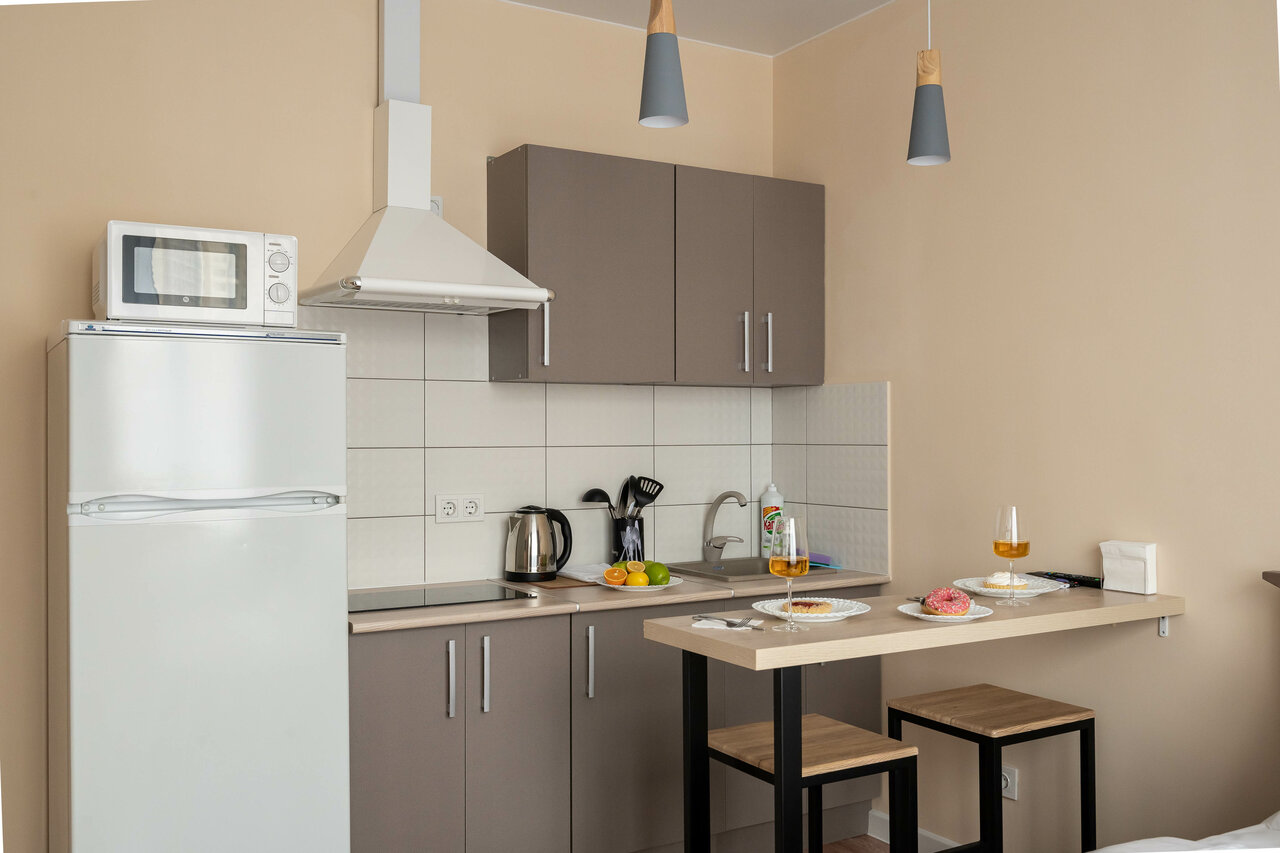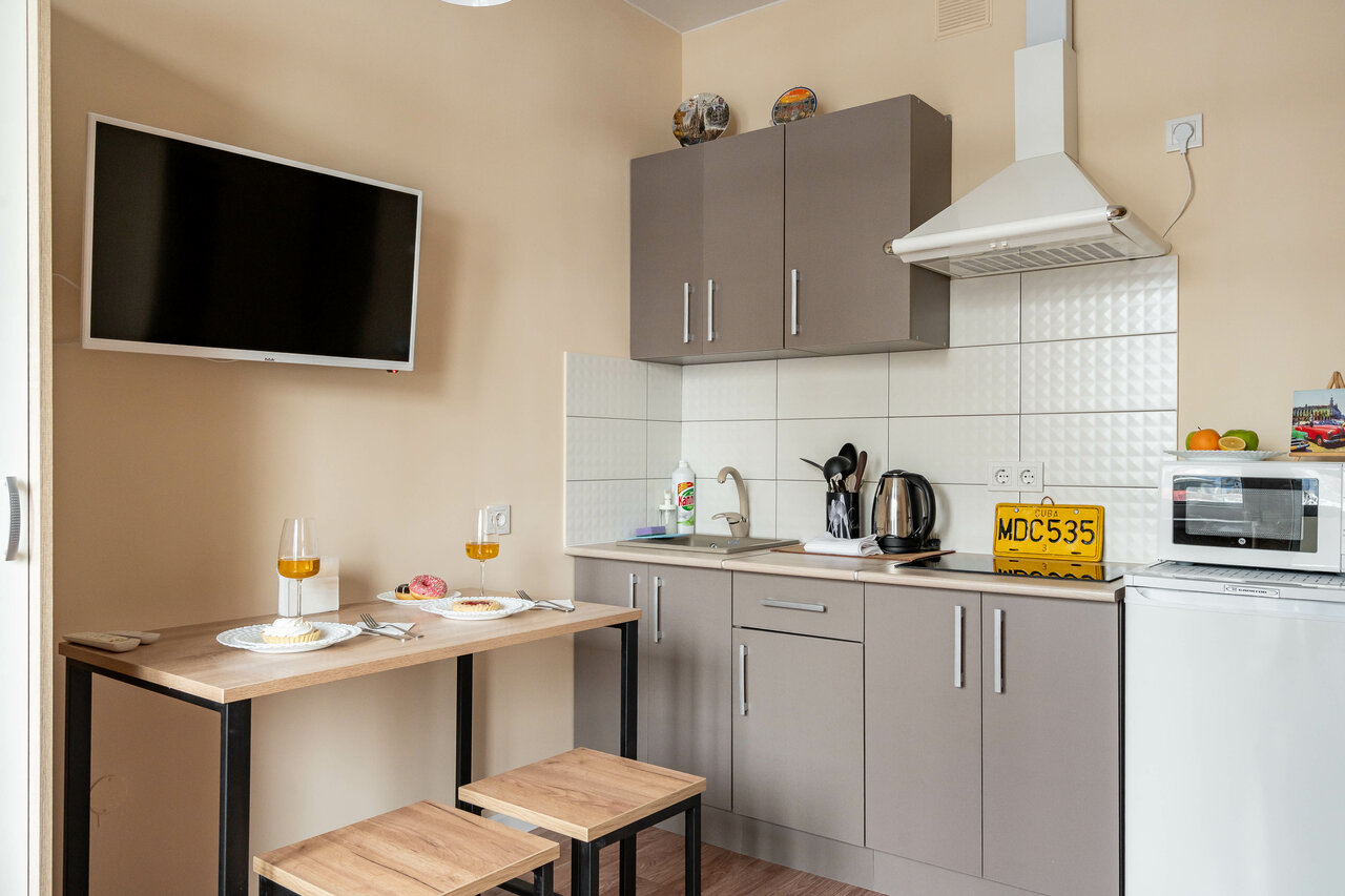 Гостиница предлагает комфортные номера с кухонными уголками, бесплатным Wi-Fi, телевизором, холодильником и чайно-кофейными принадлежностями. Для гостей доступны парковка, лифт, стиральная машина и утюг. Время заезда — с 15:00, выезда — до 12:00.