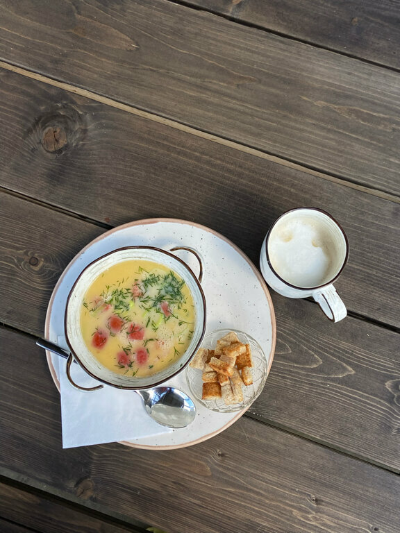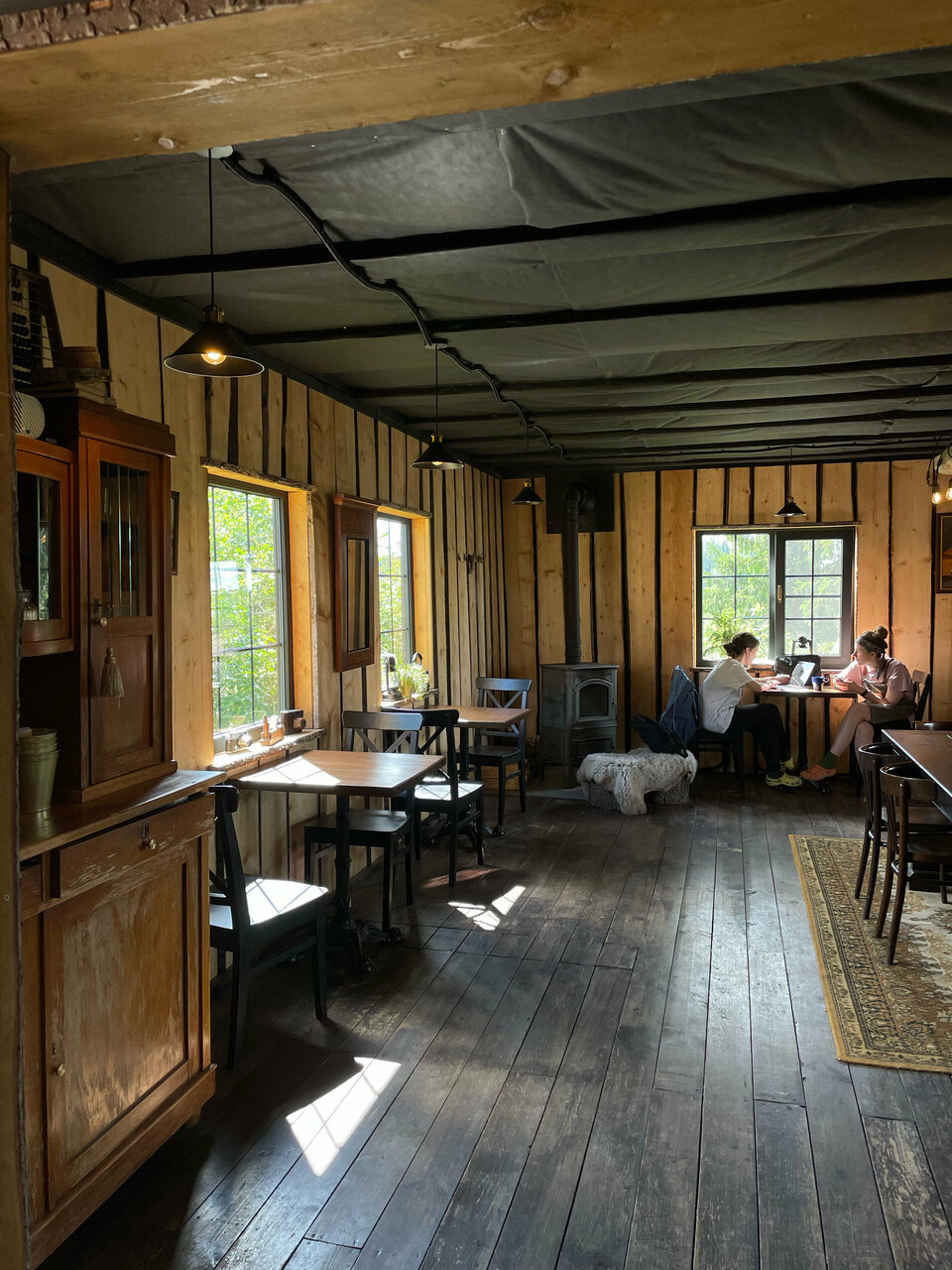 Очень аутентичное завеление в живописном месте. Терраса с хорошим видом, интерьер с вниманием к мелочам, очень ламповая атмосфера — ребята с юмором и теплом. Очень понравилась еда — особенно вафли с домашним мороженым. Это прям и десерт и наесться. Ну и отдельный плюс за то, что в меню в каждой позиции используется что то карельское. Никак не ожидали наткнуться на такое место, когда бронировали глемпинг. ПС. Отдельный респект за печатную машинку и ретро телефонный аппарат на ресепе. Теперь у нас Карелия ассоциируется именно с вами ППС. Очень улыбнуло письмо из Хогвартса на двери под лестницей