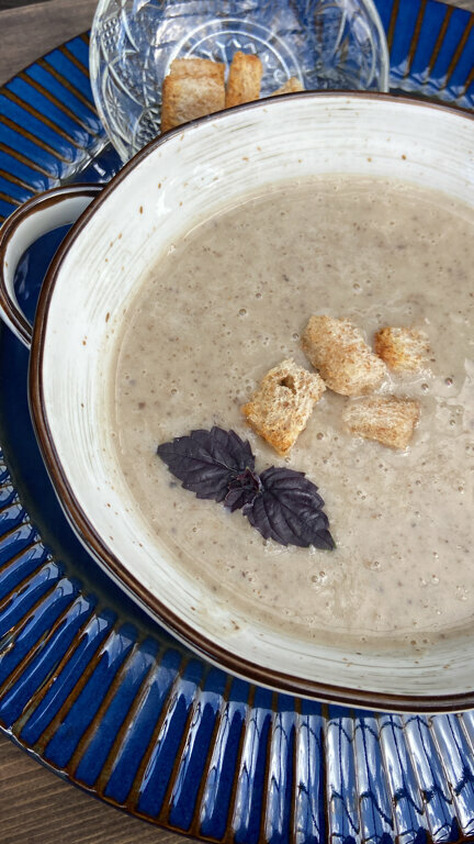 Мясной борщ с домашним салом, черным хлебом и подкопченой сметаной