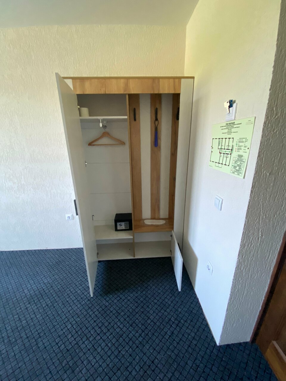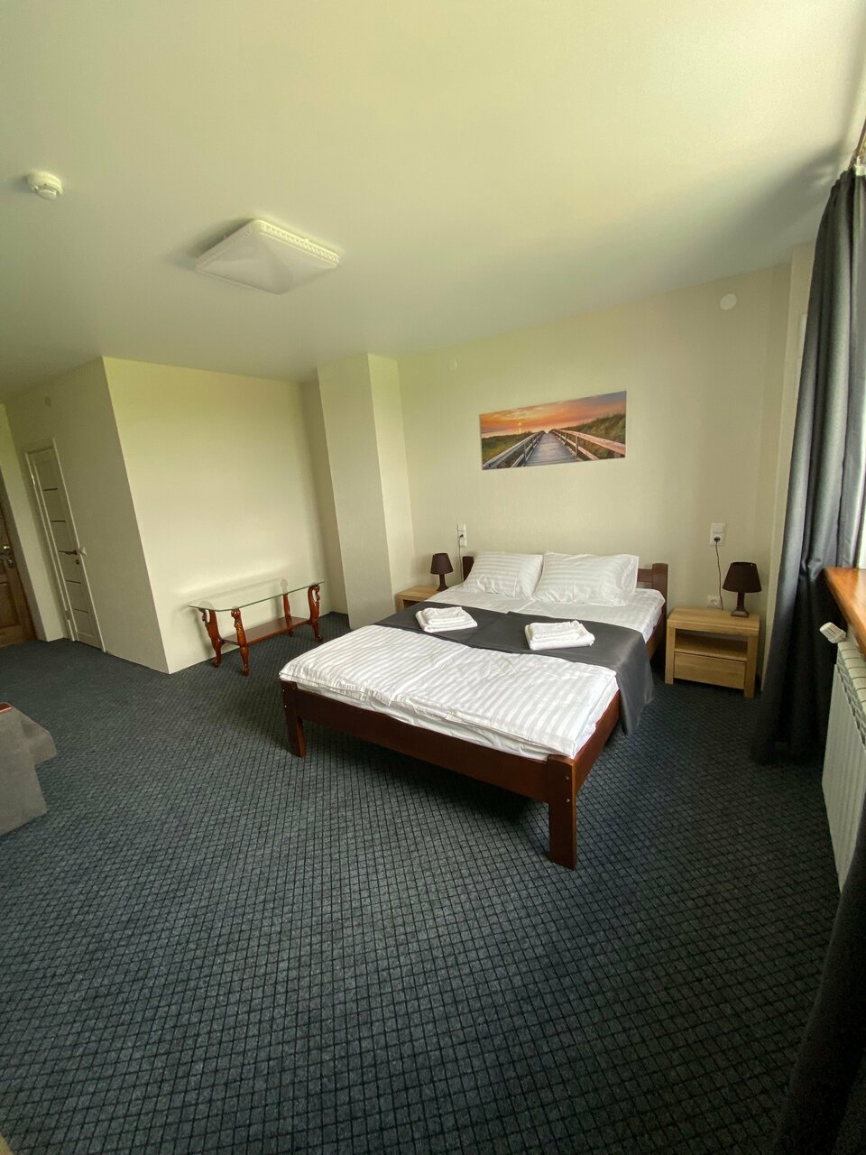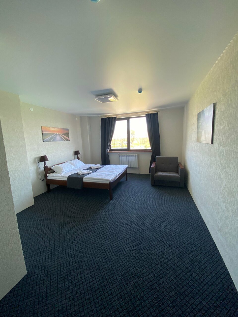 В номере двуспальная кровать, кресло кровать, телевизор, туалет и душ в номере. Есть гостевые средства гигиены, тапочки, полотенца, фен, постельное белье.