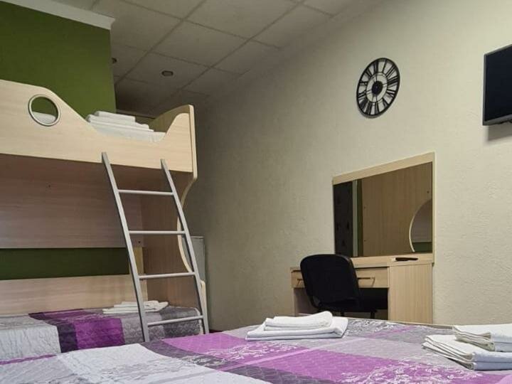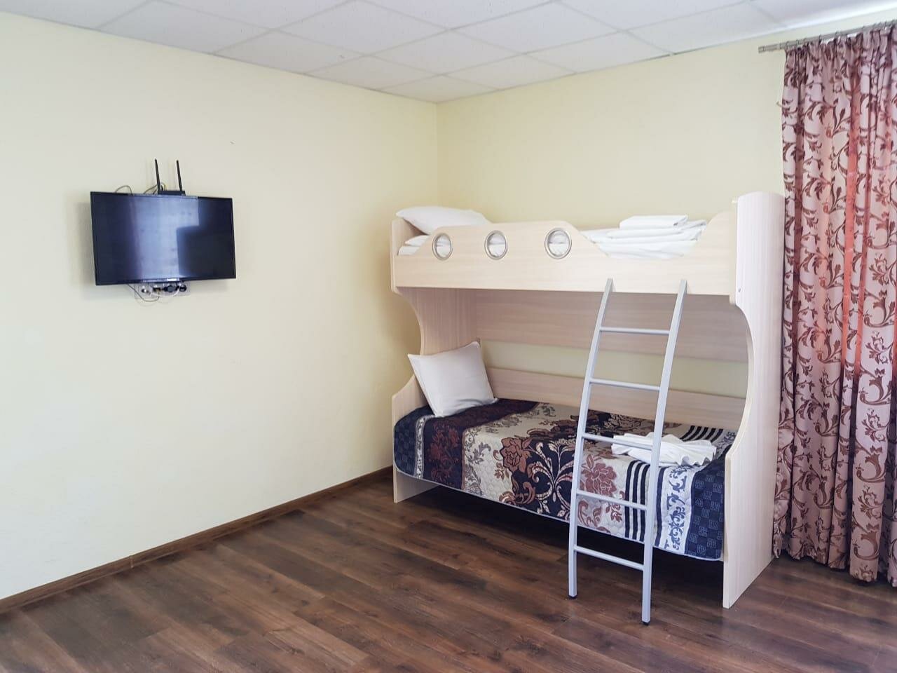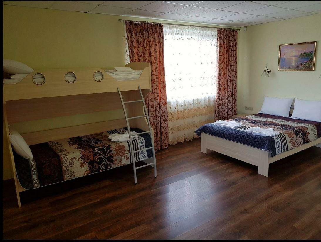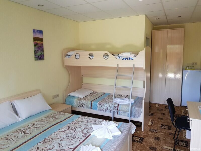 Комнаты расположены на 1-м и 2-м этаже.В комнате одна 2-х спальная и одна двухъярусная кровати, тумбочка, шкаф, туалетный столик с зеркалом, холодильник, санузел с душевой кабиной, сплит-система, телевизор, постельное белье и полотенца для душа.