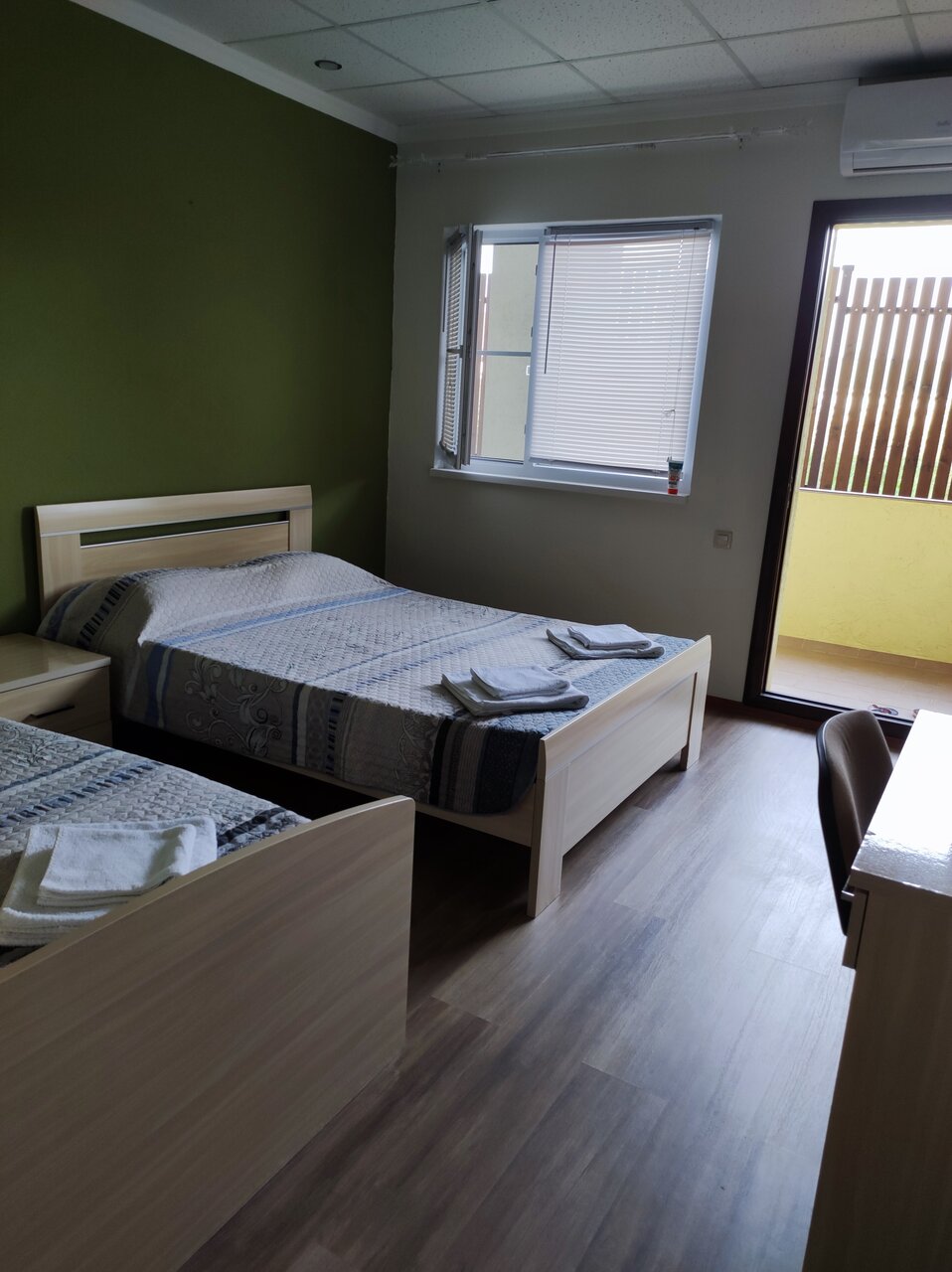 Комнаты расположены на 2-м этаже, с видом на бассейн.В комнате 2-х спальная и одна двухъярусная кровати, тумбочки, шкаф, туалетный столик с зеркалом, холодильник, санузел с душевой кабиной, сплит-система, телевизор, постельное белье и полотенца.