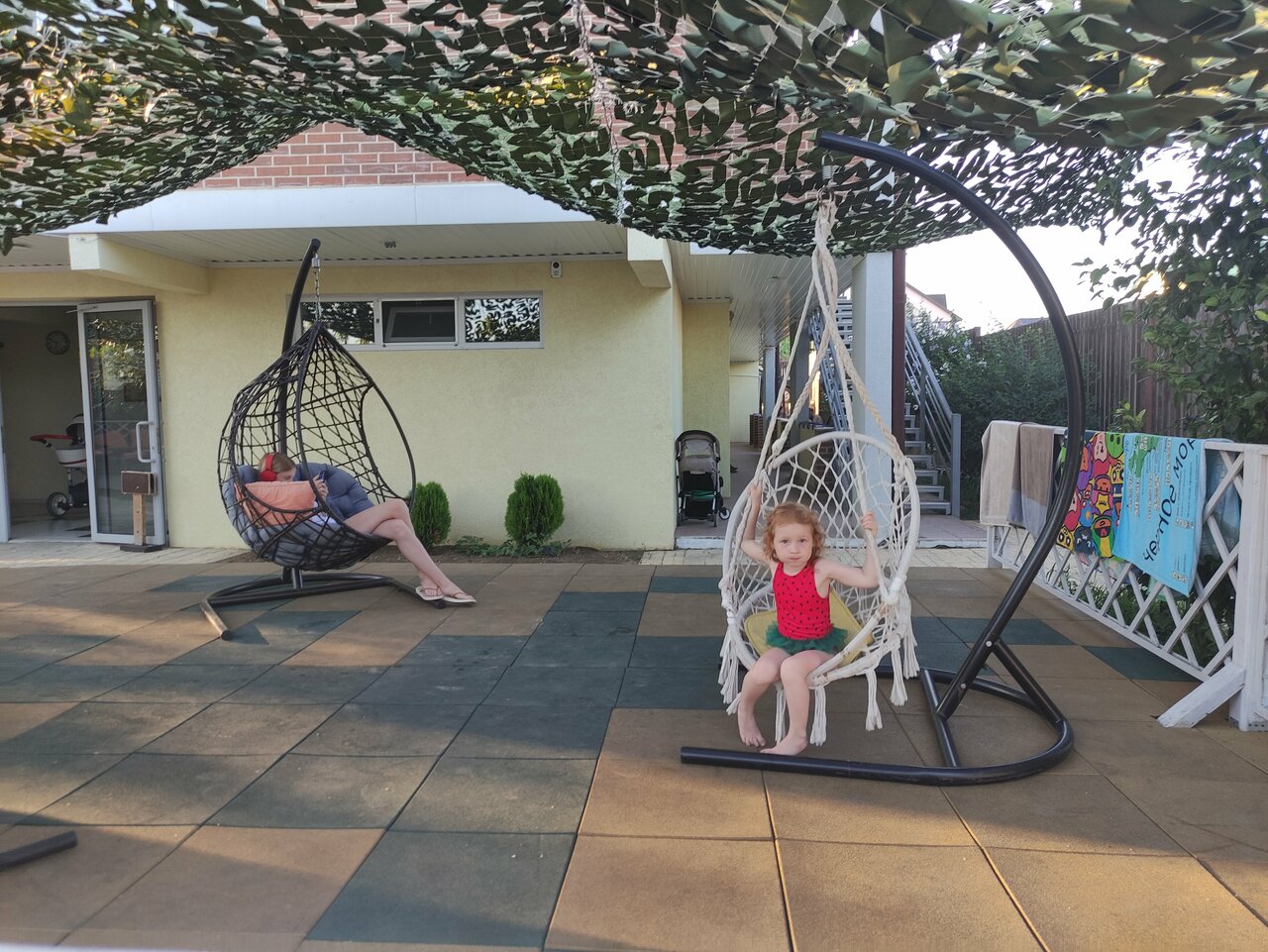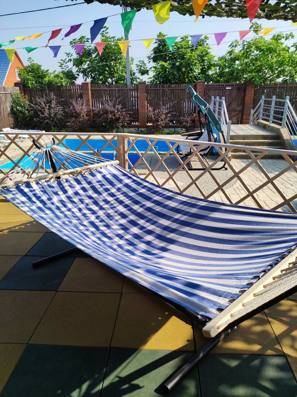 - Ухоженная территория с зонами отдыха (шезлонги, гамаки, качели).