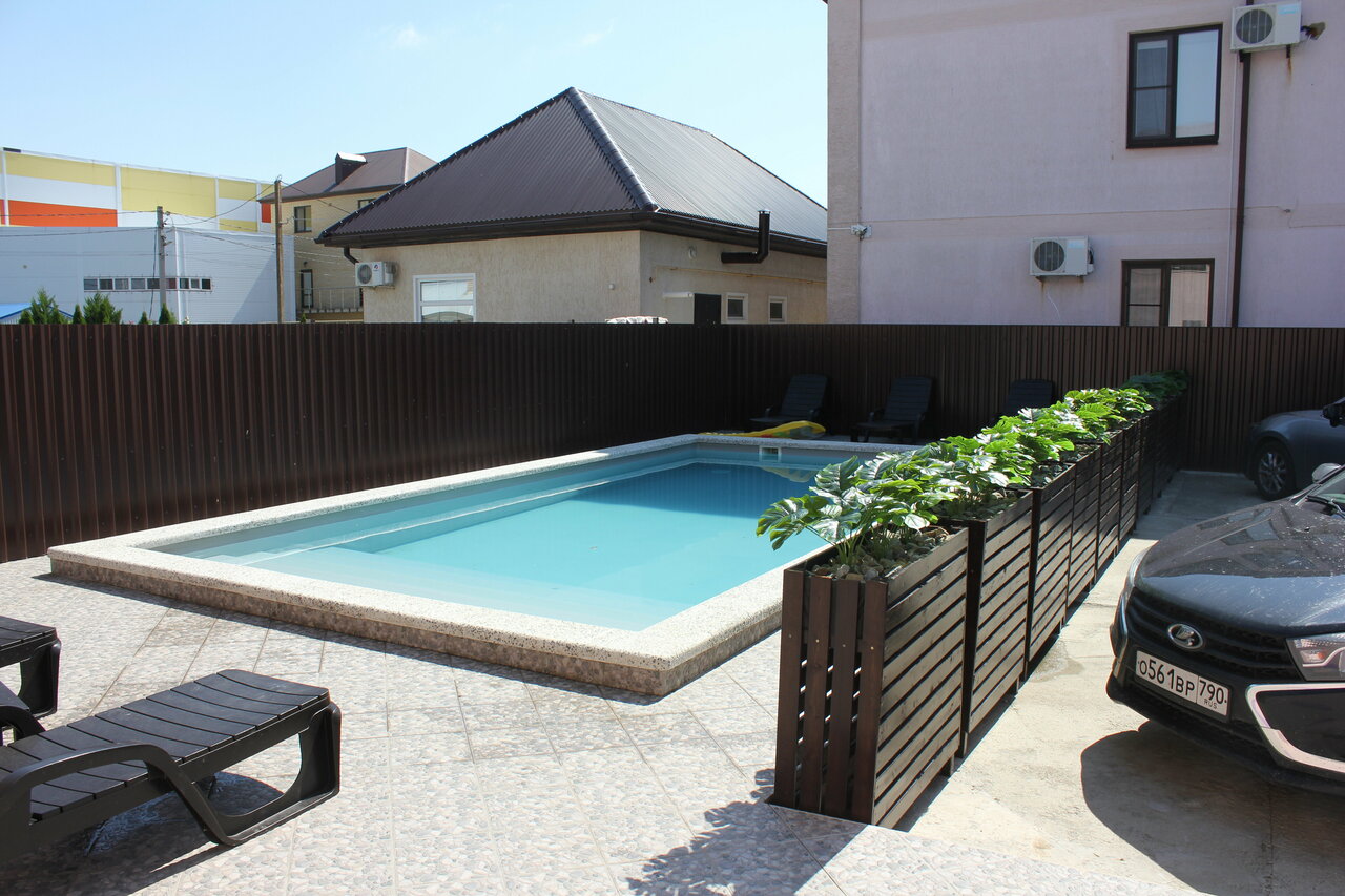 Приезжаю в эту гостиницу 3 год подряд. Прекрасная маленькая гостиница, очень тихо и спокойно! Номера не большие, но стильные, чистые, в номерах свой санузел, хороший телевизор, спит, мини холодильник, шкаф для одежды, большие прикроватные тумбочки, полотенца. На территории отдельстоящая кухня со столовой, где тоже есть сплит, телевизор, столики со стульями, а кухня полностью оборудована, раковины, всё принадлежности для мытья посуды, газовая плита с духовкой, вытяжка, микроволновка, холодильник, рабочие столы, вся посуда для готовки и приёма пищи, бокалы. Во дворе 3 беседки, небольшая детская площадка, бассейн, шезлонги, парковка для машин, мангальная зона, ухоженная территория, тротуарная плитка, зелёные наслаждения, возле каждого номера столик мо стульями на общей террасе. Море в шаговой доступности. Маленький минус — в санузеле микрораковина, но мне это не очень мешало. Очень приятная стоимость номера. Мне всё очень понравилось, очень рекомендую данный отель.