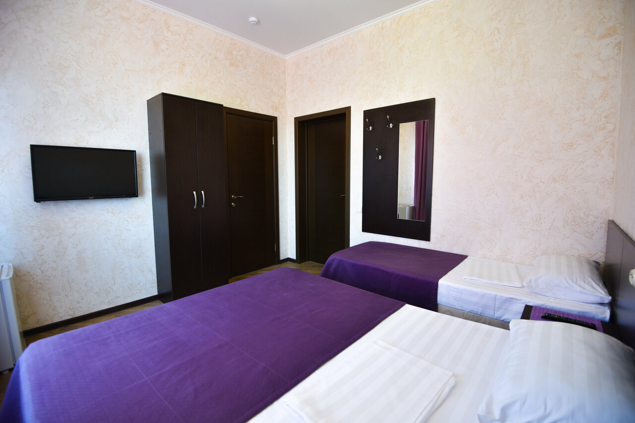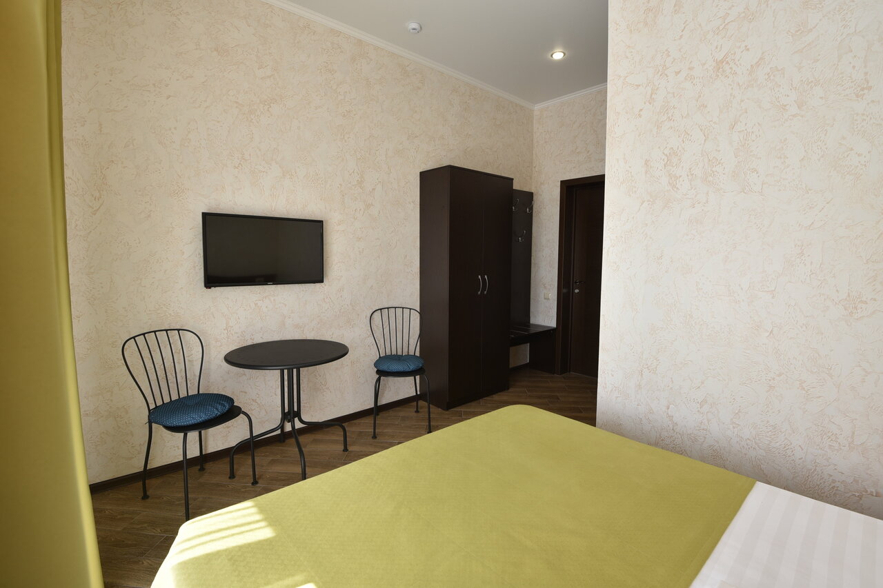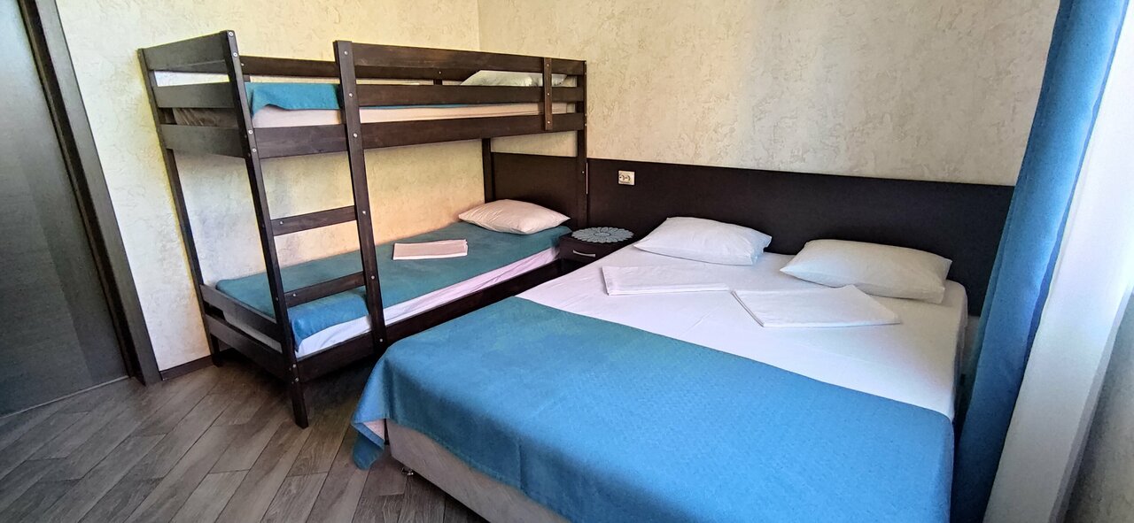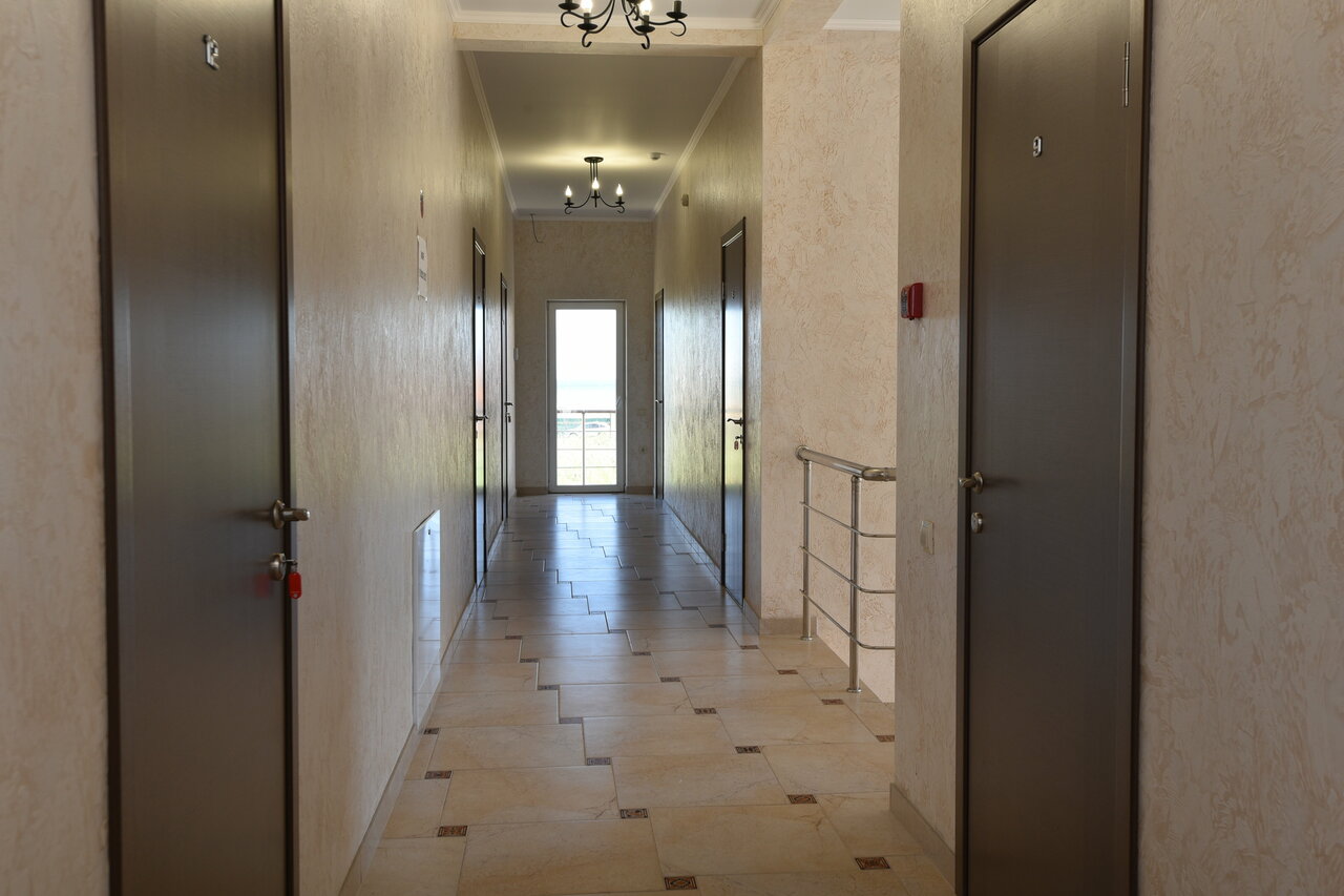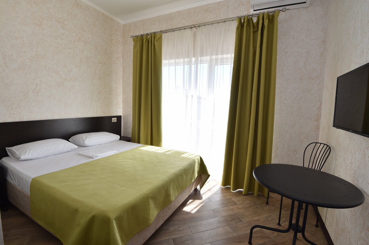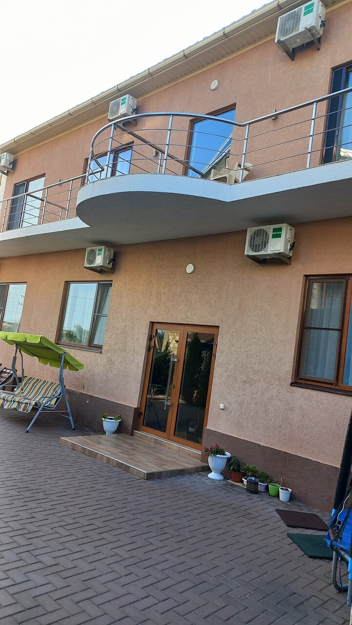 Хороший мини отель. здание новое, ремонт современный. Пол в номерах кафельный. Санузел в номерах в современном стиле. Кондиционер , ТВ, мини холодильник, все что нужно для комфортного проживания.во дворе беседка с общей кухней где есть всё необходимое для приготовления пищи и также столы для посиделок. Мангал также есть(возможно нужно поставить ещё один).есть детская зона с батутом и качелями.до моря идти пешком 2-3 минуты.