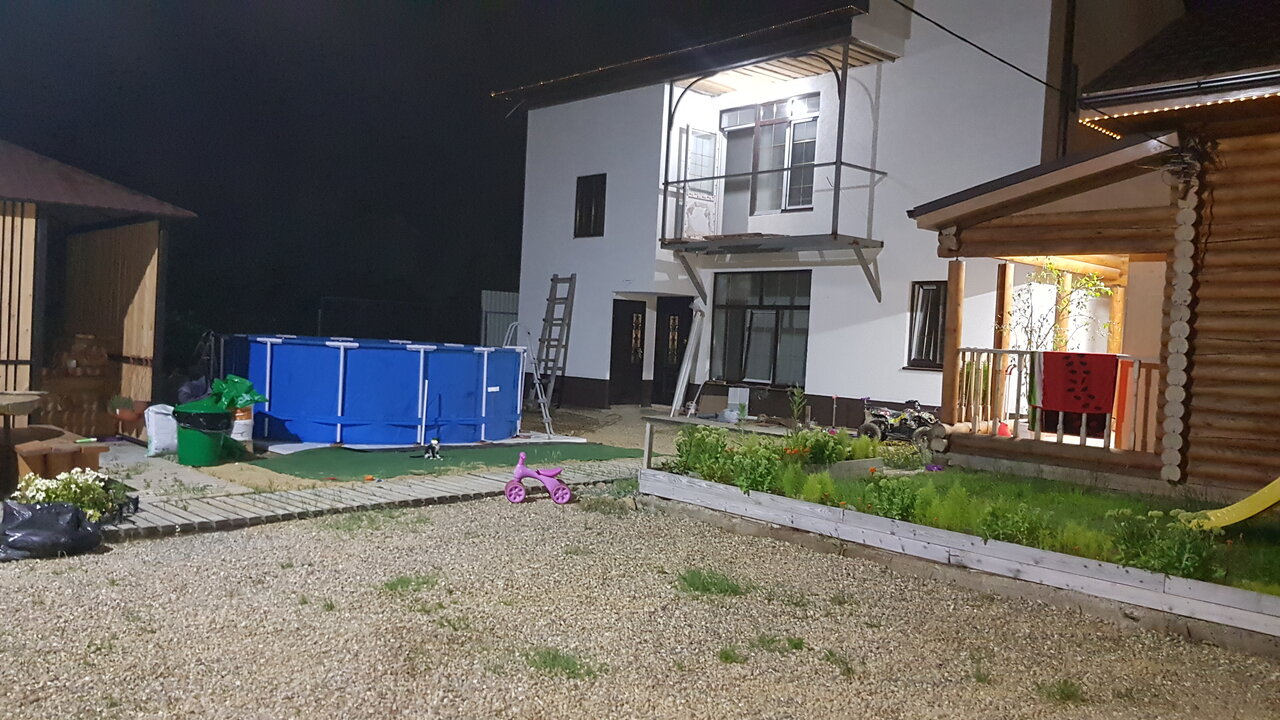 Приятный двухэтажный брусовый дом на две семьи, есть кухня, кондиционер на втором этаже, там две спальные зоны, на первом этаже телевизор с плоским экраном. Во дворе небольшой бассейн и мангальная зона с беседкой. Пляж в 70 метрах, пляж широкий и песочный, море чистое.
