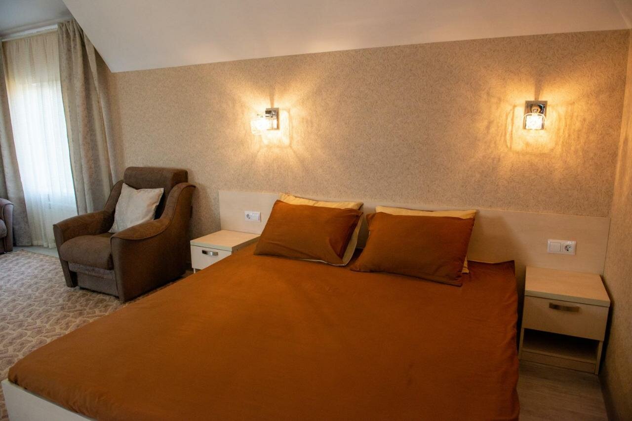Уютный двухкомнатный номер с двуспальной кроватью и двухместным диваном. В номере есть все необходимое для комфортного проживания: постельное белье, комплект полотенец, телевизор, ванная комната с гигиеническими принадлежностями.