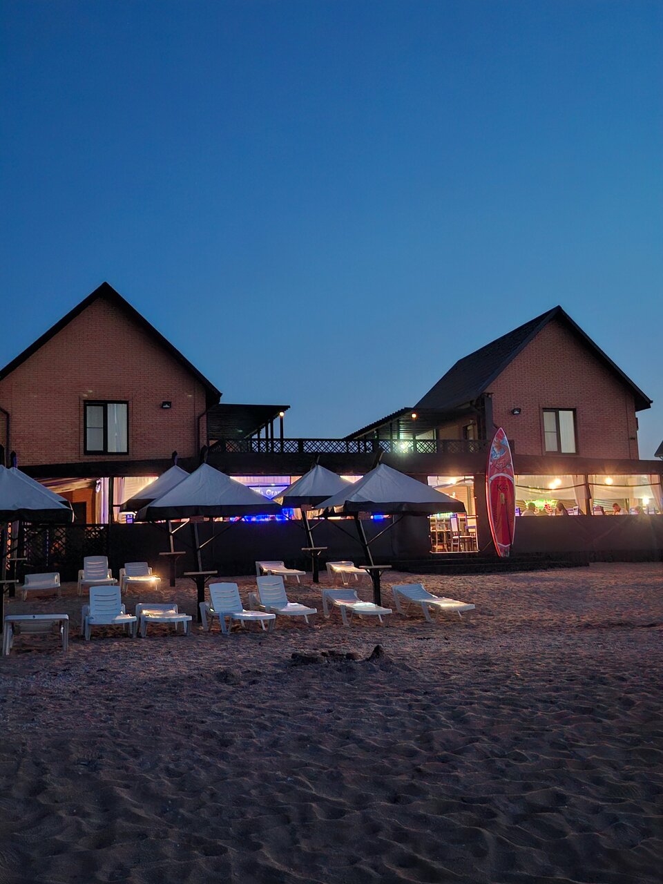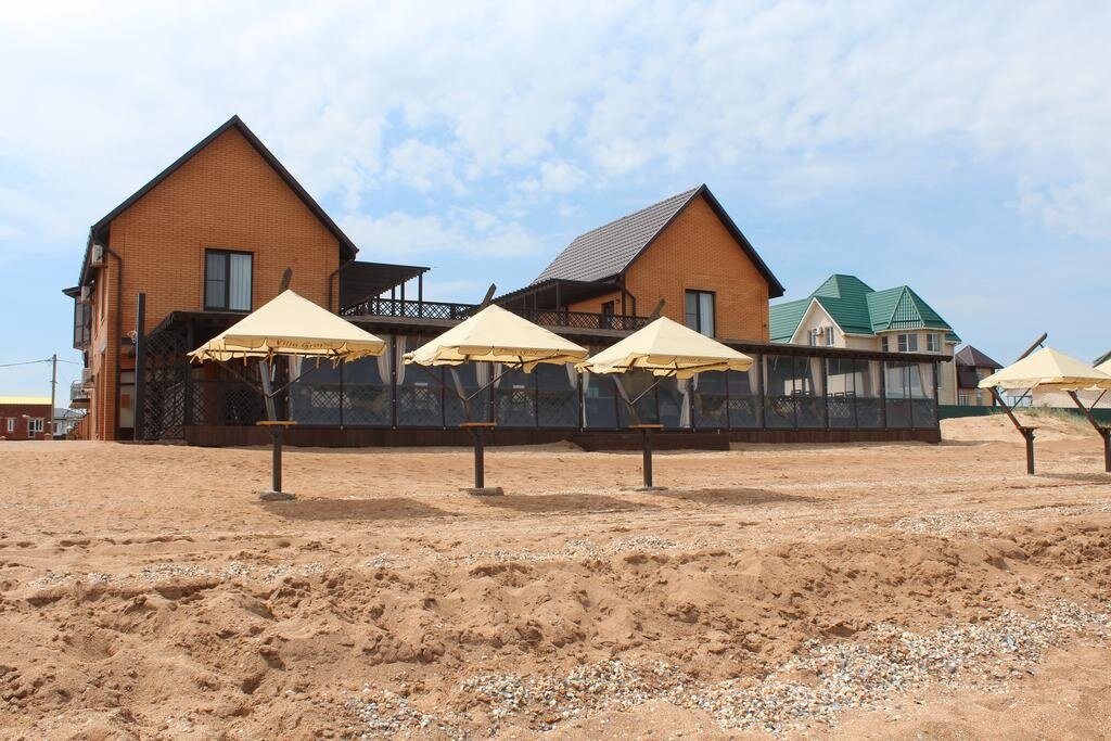 Приезжаем сюда на пляж! Про гостиницу не могу ничего сказать,но всегда занята-значит хорошая! Первая линия,на пляж выходит веранда с баром!!! Были 8-го августа,медуз много, запах отвратительный от моря.. Не купались,сразу уехали дальше. Но приезжали 14 июня-все хорошо,купались! Вода правда была прохладная,но купаться было приятно! Пляж чистый..есть зонтики.