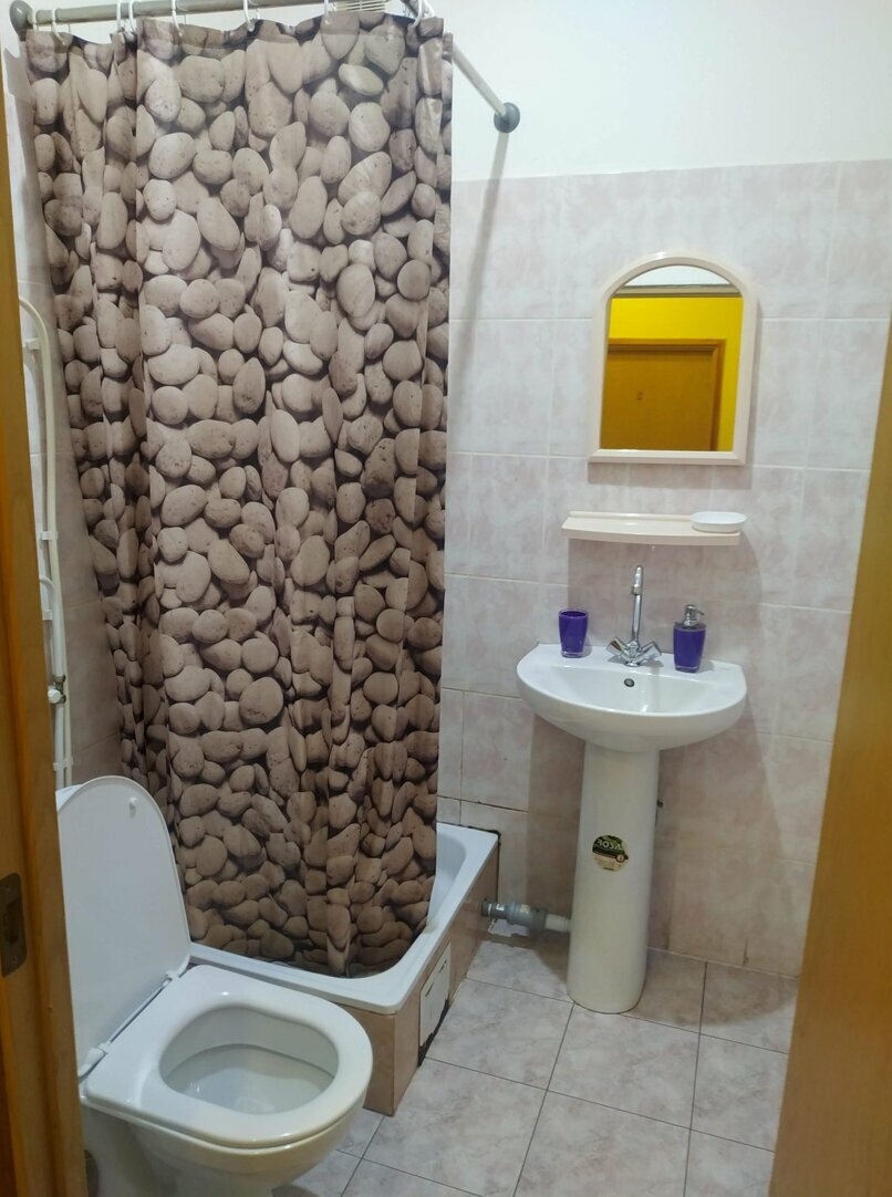 Твёрдая тройка. Постельное чистое. А вот за кроватями вообще нет. Душ и туалет в норме для дешёвой гостиницы. На общей кухне нет посуды и приборов.