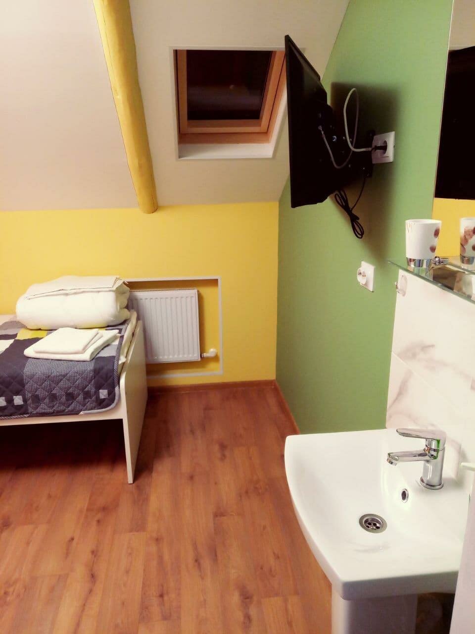 Хорошая гостиница. Я жила в одноместном номере в мансарде. В номере есть раковина, это удобно. Смарт телевизор. Свежий ремонт