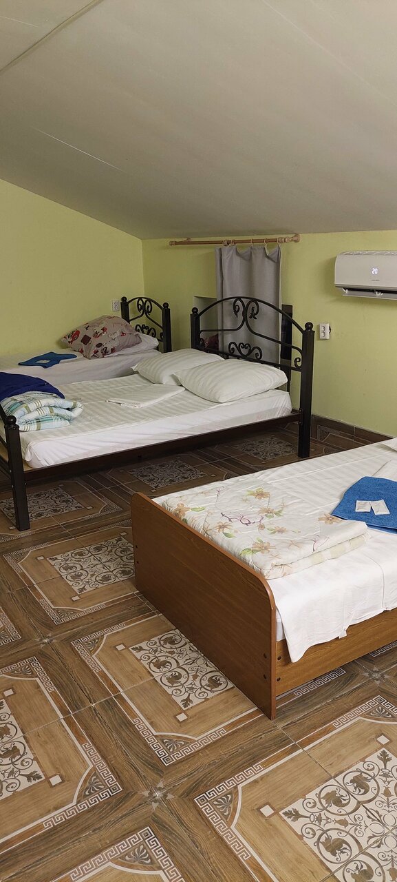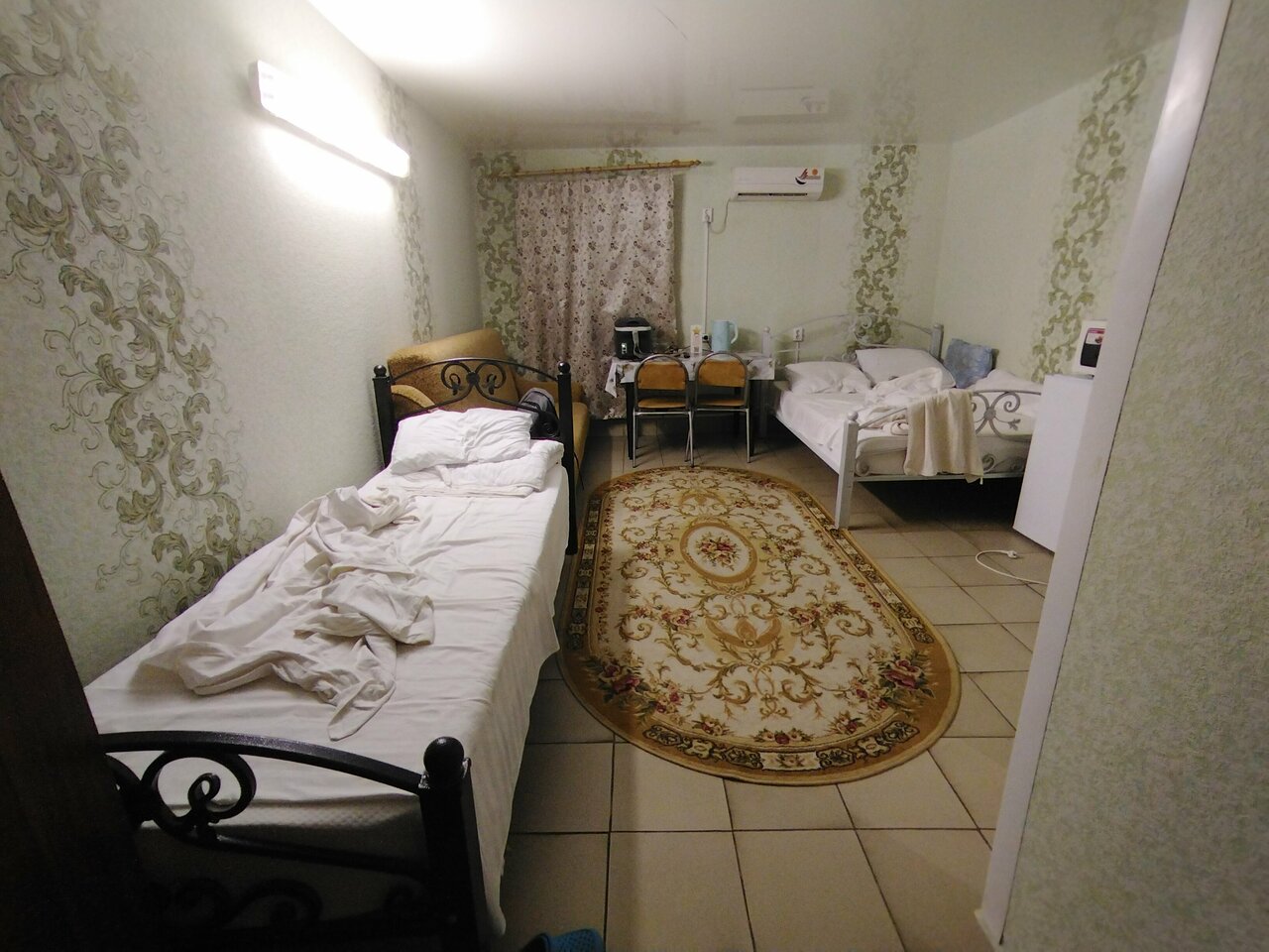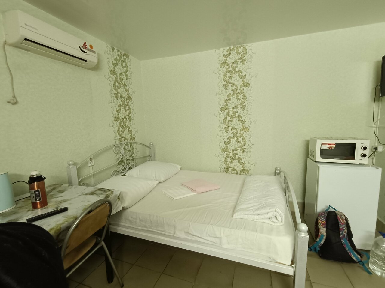 Кровати с матрацами норм, есть телек, кондей (не включали) и чайник со стаканами, но всё остальное просто отврат за 2500 (3-х местный): туалетной бумаги нет, как и всех туалетных принадлежностей, всё грязное, обои отваливаются, москитка на окне порвана полностью, душ с туалетом отдельная история, слышимость колоссальная. Для ночлега на 1 ночь сойдёт, но не за такие деньги. Не советую…