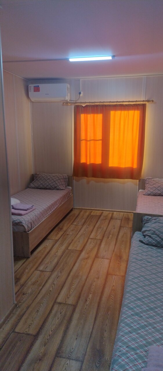 Несмотря на ‘барачность’ оказалось очень мило и уютно. Хозяева очень отзывчивые и доброжелательные. В номере кроме кроватей стол, чайник с чаем, туалет и душ, вентилятор вместо кондиционера. Мне не хватило тумбочки и раковины. Но очень понравилось место для зубных щеток: дочь все щетки туда сразу выложила ). И матрасы в нашем номере оказались непродавленными, но пружины чувствовались. Переночевать в дороге в целом неплохо.