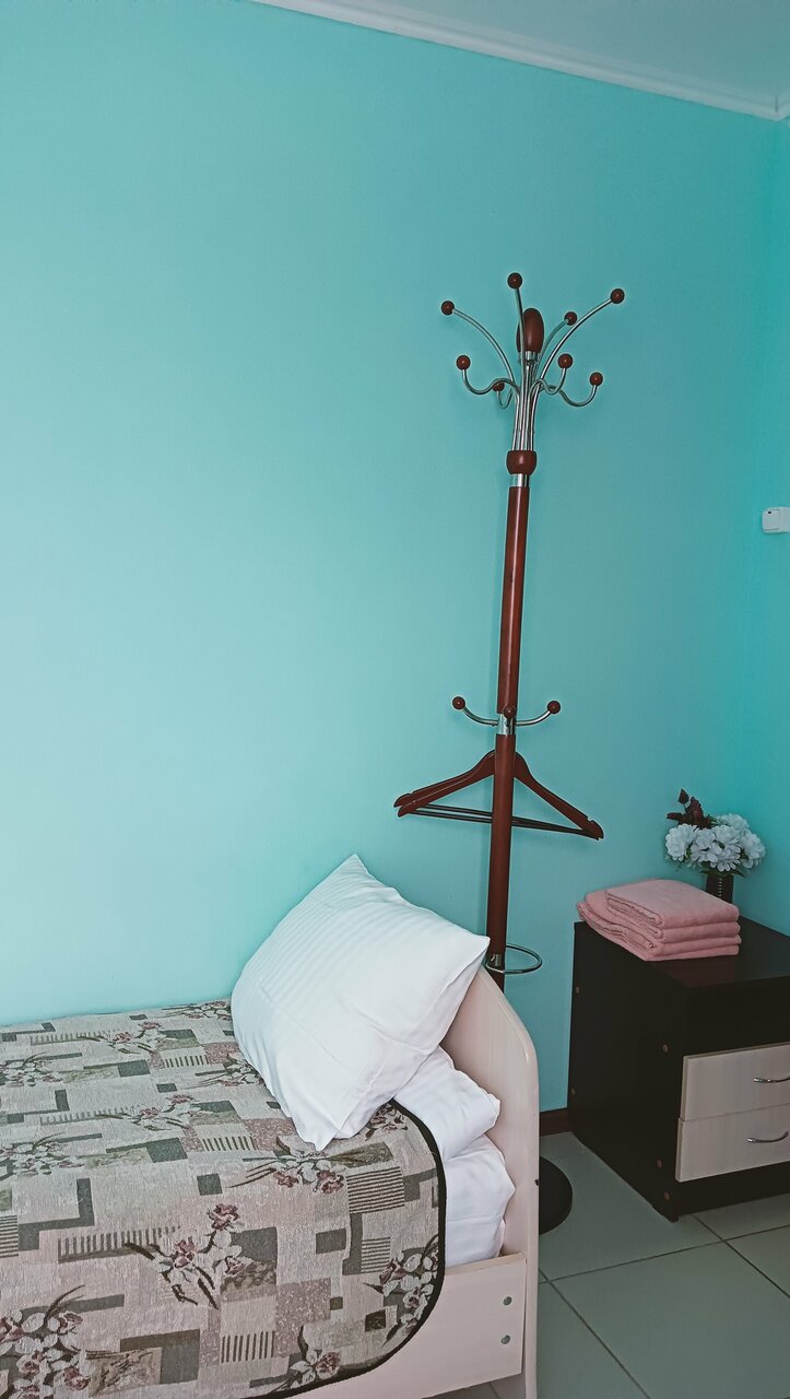 В номере душевая кабина и раковина с зеркалом .Из мебели комод для белья, прикроватная тумбочка, вешалка для верхней одежды.Туалеты на этаже.Махровые полотенца, белое постельное белье.Фен выдается по просьбе гостя.Для гостей предусмотрена